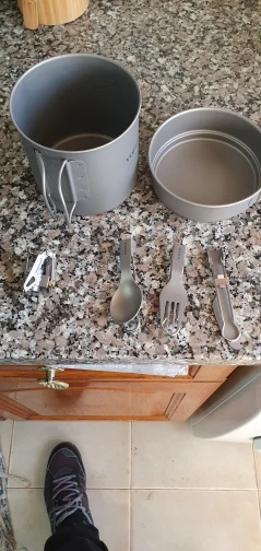 Всё в комплекте. горелка по виду оригинал, посуда сплав титана (недорогой сплав). за эти деньги весьма неплохо.