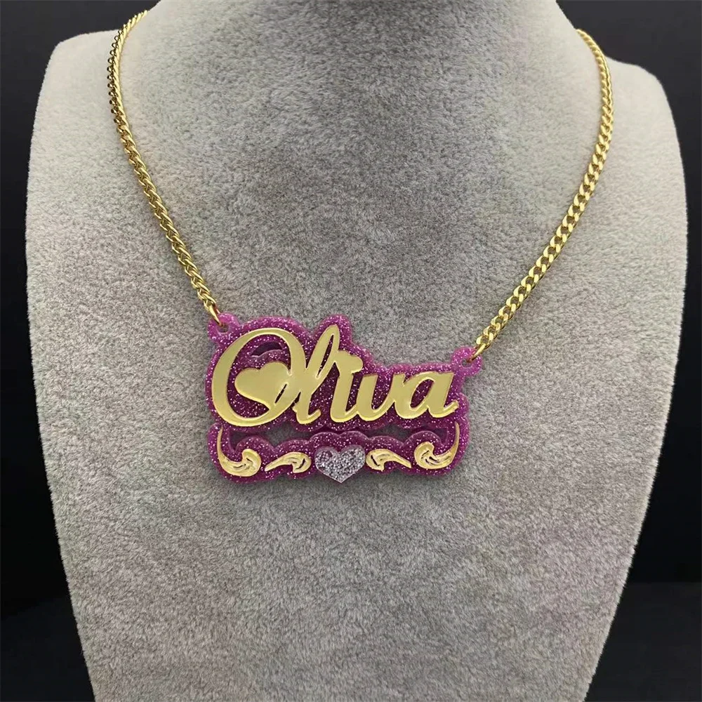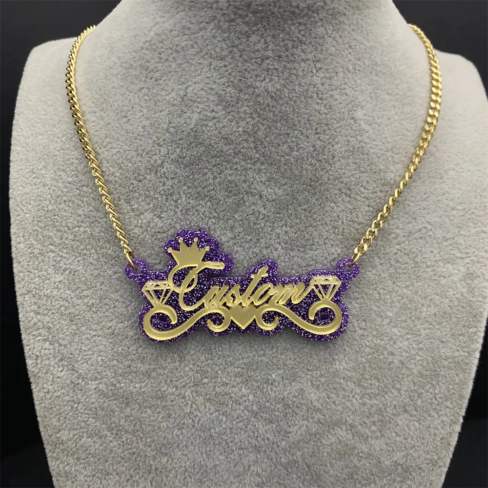 Ожерелье с именем на заказ, кубинская цепь из нержавеющей стали, персонализированное акриловое название с короной, Женское Ожерелье, подарки