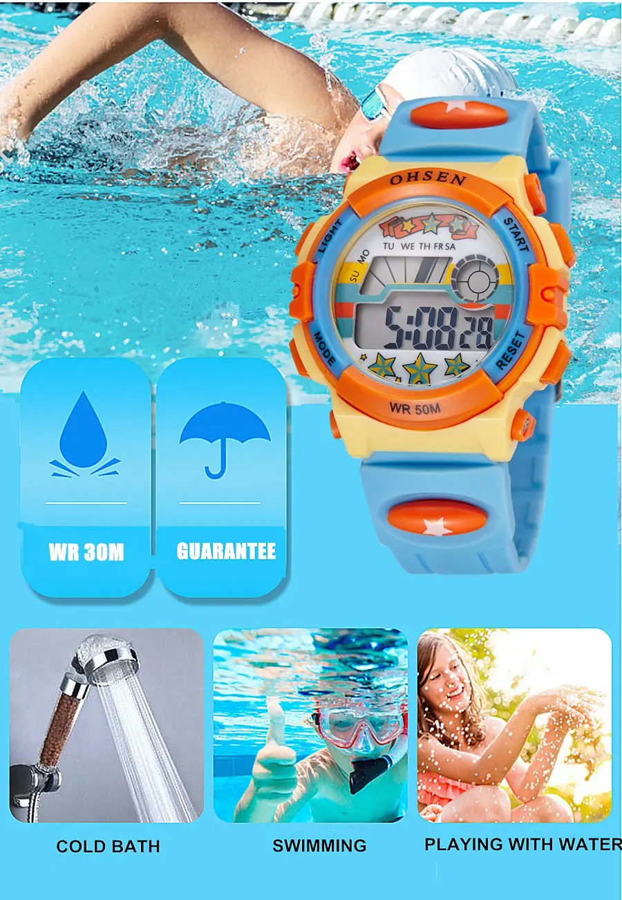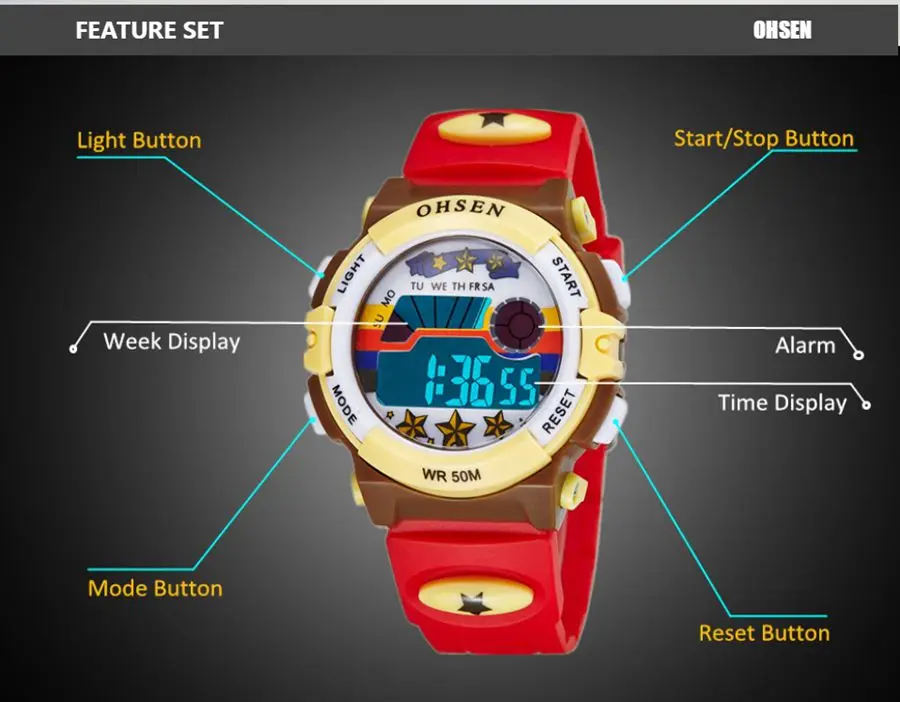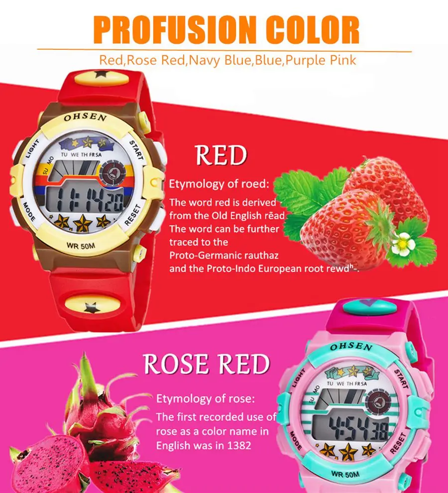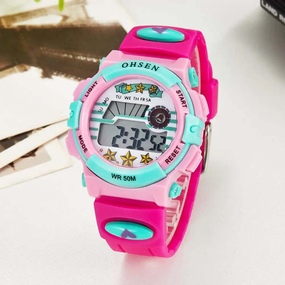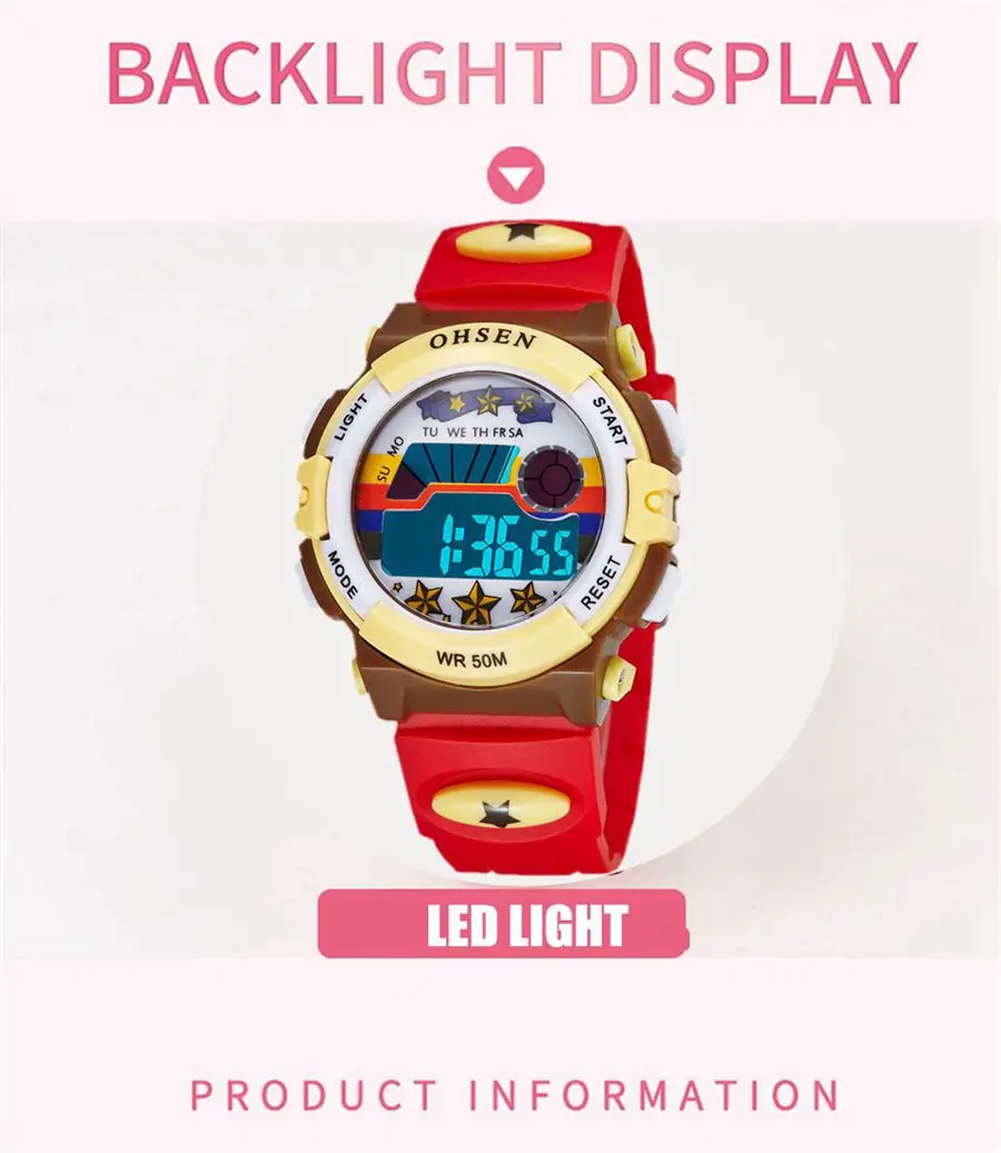 OHSEN детские спортивные часы 50 м водонепроницаемые красные Мультяшные цифровые наручные часы Секундомер электронные светодиодные детские часы для мальчиков и девочек