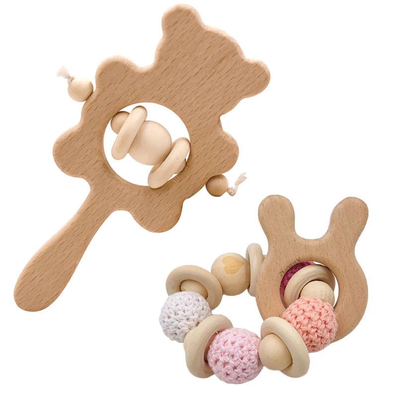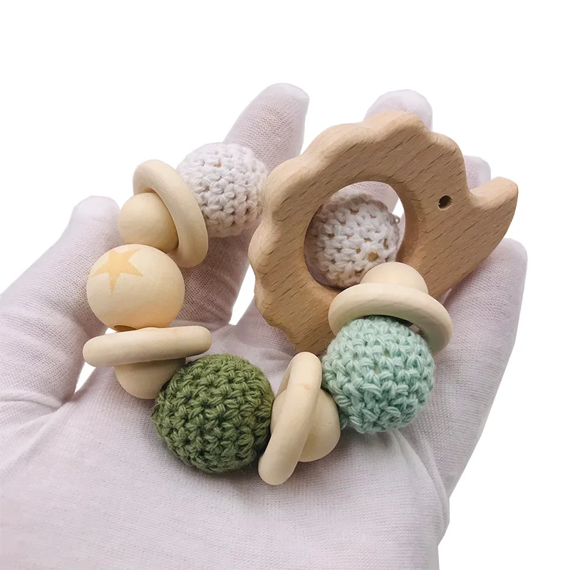 Детский деревянный Прорезыватель для зубов, детские браслеты для ухода, Музыкальная погремушка без бисфенола А, деревянные кольца для грызунов, крючком, бусины, игрушка для жевания, подарки новорожденным