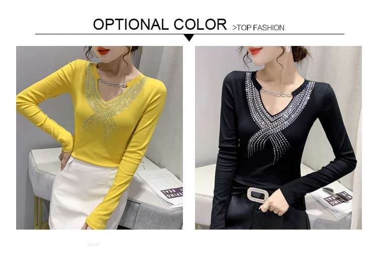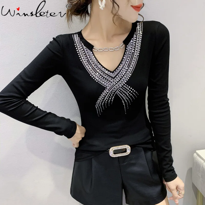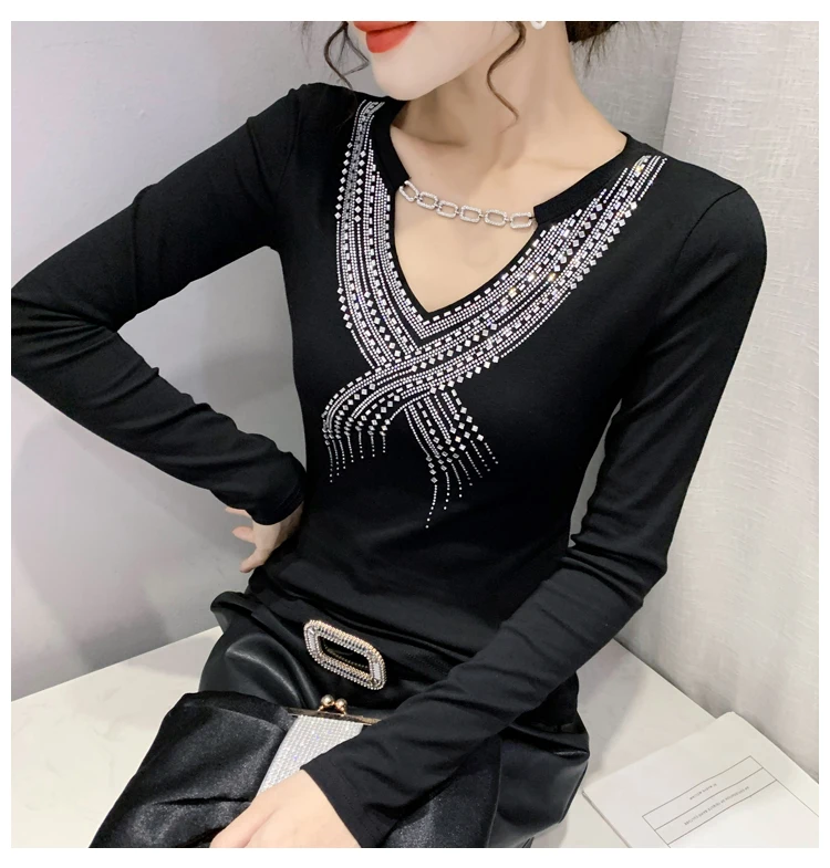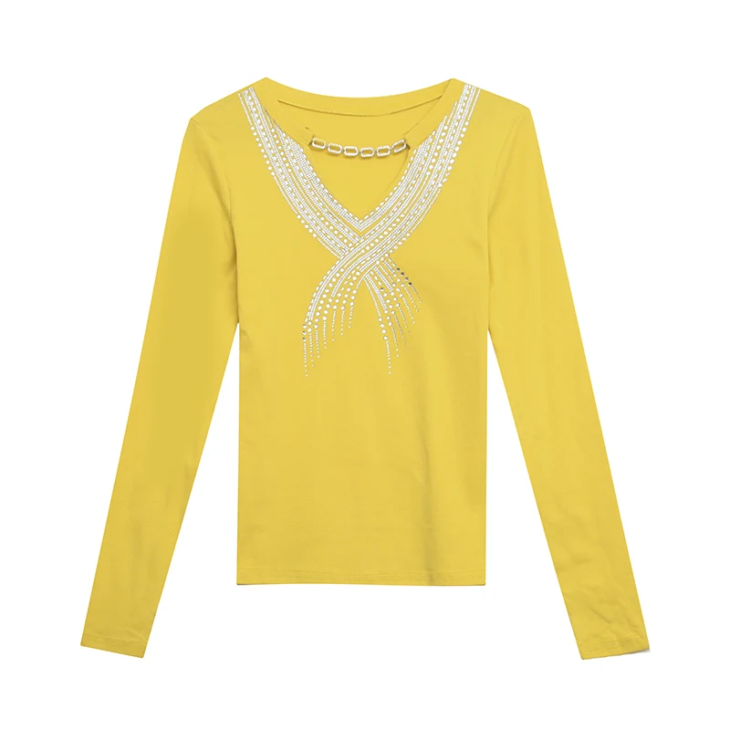 Женская хлопковая футболка с длинным рукавом и цепочкой со стразами, T1D915A