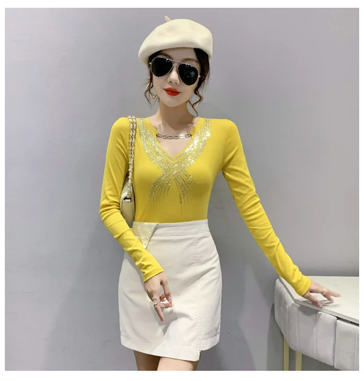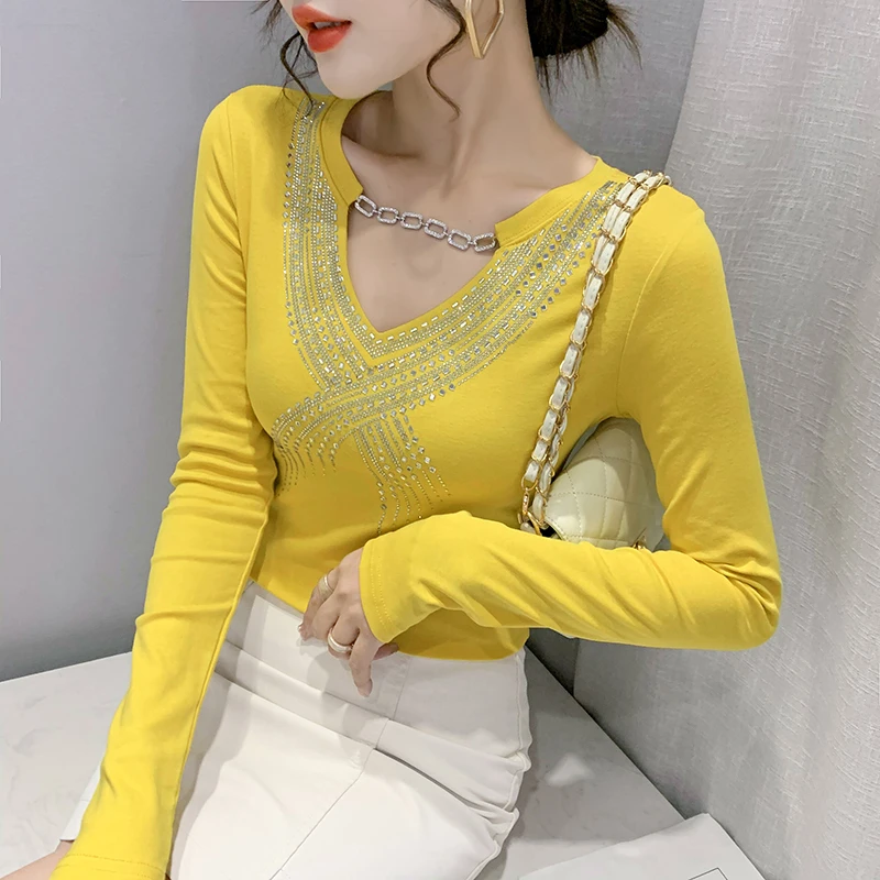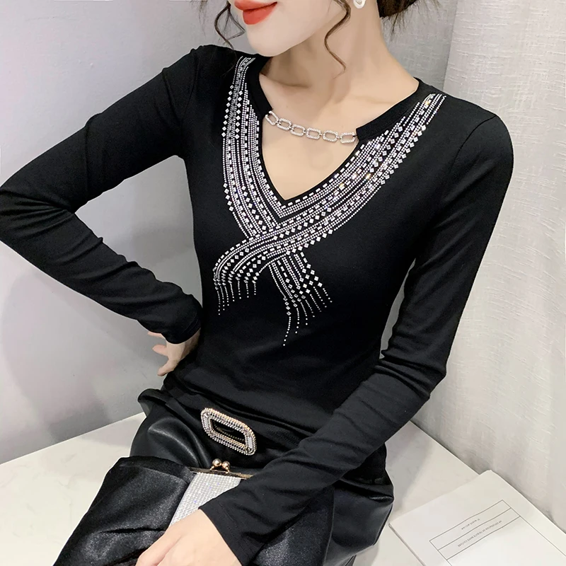 MadBlack/весенняя одежда, Женская хлопковая футболка, шикарная сексуальная блестящая цепочка с бриллиантами, женские топы с длинными рукавами, подходящие ко всему, 2022 футболки, T1D915A
