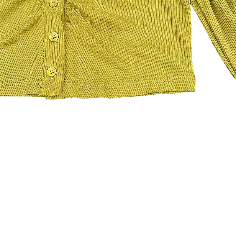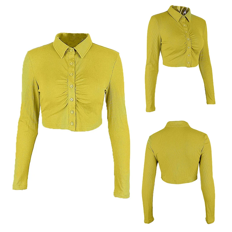 Женский укороченный топ, воротник с отворотом, сплошной цвет, длинный рукав, ребристая поверхность, плиссированная рубашка на груди