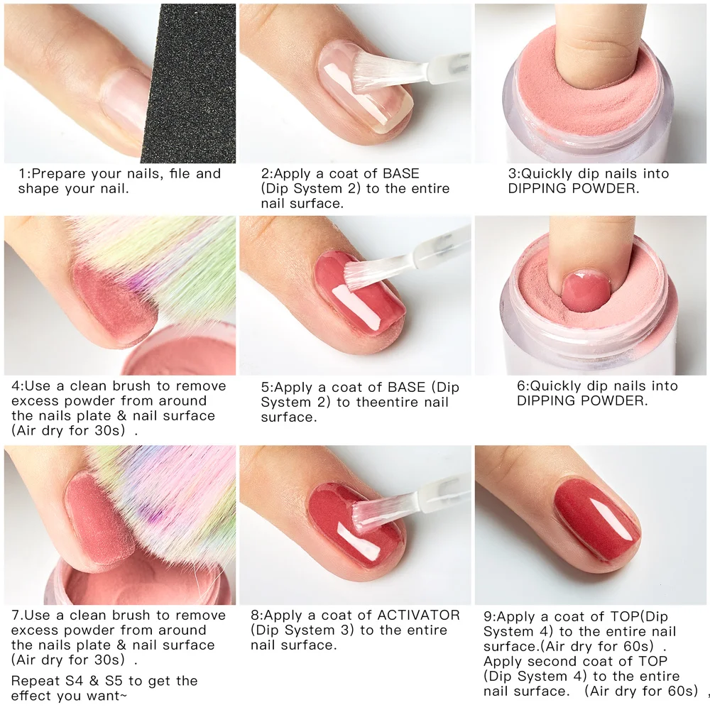 Цвет: как показано на фотографияхПосылка:1 Набор окунания порошки для ногтейХарактеристика:Преимущества просты и быстро наносятся, более долговечны, чем лак для ногтей, а недостатком является то, что его нелегко снять (так же, как и гель для ногтей)Может использоваться на натуральных ногтях и накладных ногтях.Обеспечьте фантастический естественный вид ваших ногтей.Идеально подходит для домашнего использования или профессионального использования.Как использовать:1. Подготовьте ногти.2. Нанесите тонкое пальто на основание.3. Dip-наконечник всего ногтя в блюдо.4. Удалите лишний порошок.5. Нанесите второй слой базового покрытия.6. Dip-наконечник гвоздя в блюдо для достижения желаемой линии улыбки.7. Удалите лишний порошок.8. Нанесите dip-активатор.9. Гладкая и улучшенная поверхность с помощью буфера.