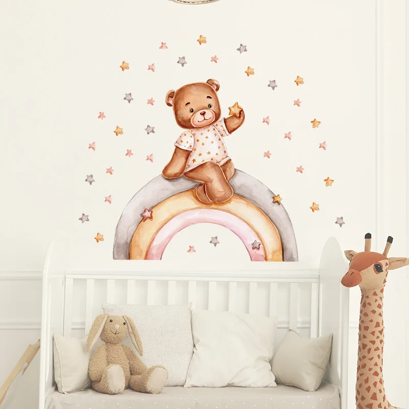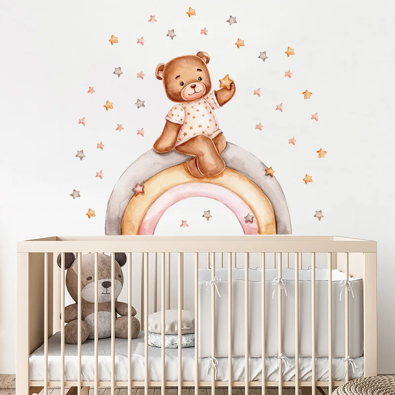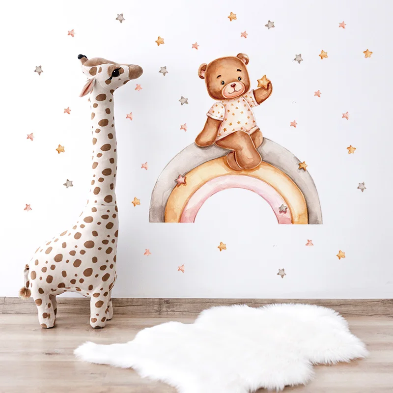 themeCartoon Girl Bear Sitting on the Rainbow Wall Stickers Colorful Stars