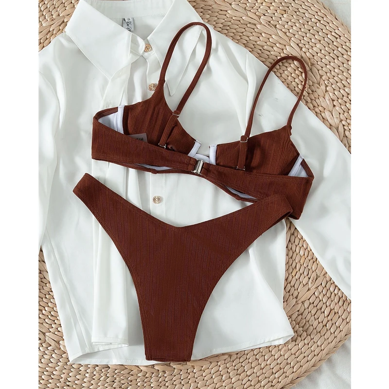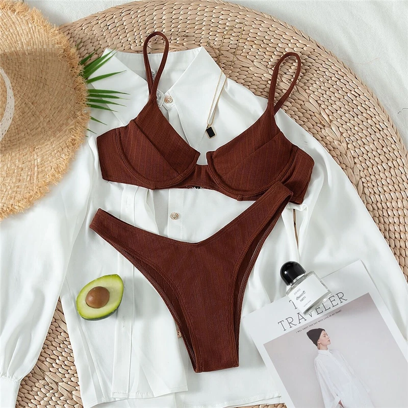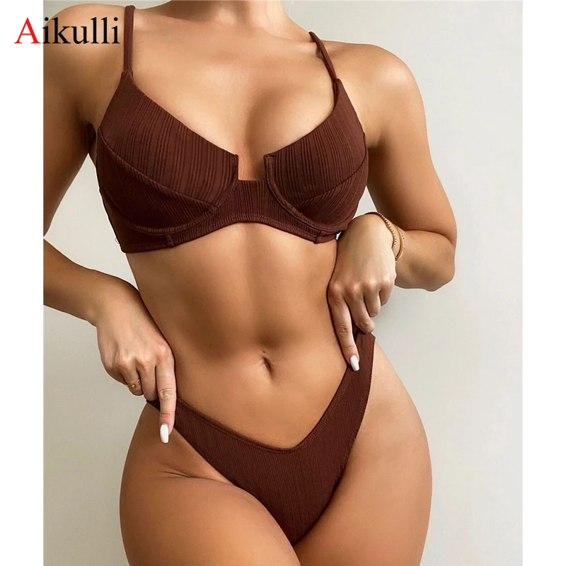 2022 сексуальное бикини на косточках, однотонная коричневая одежда для плавания, женский купальный костюм, женский комплект бикини из двух предметов, пуш-ап, пляжная одежда, купальный костюм