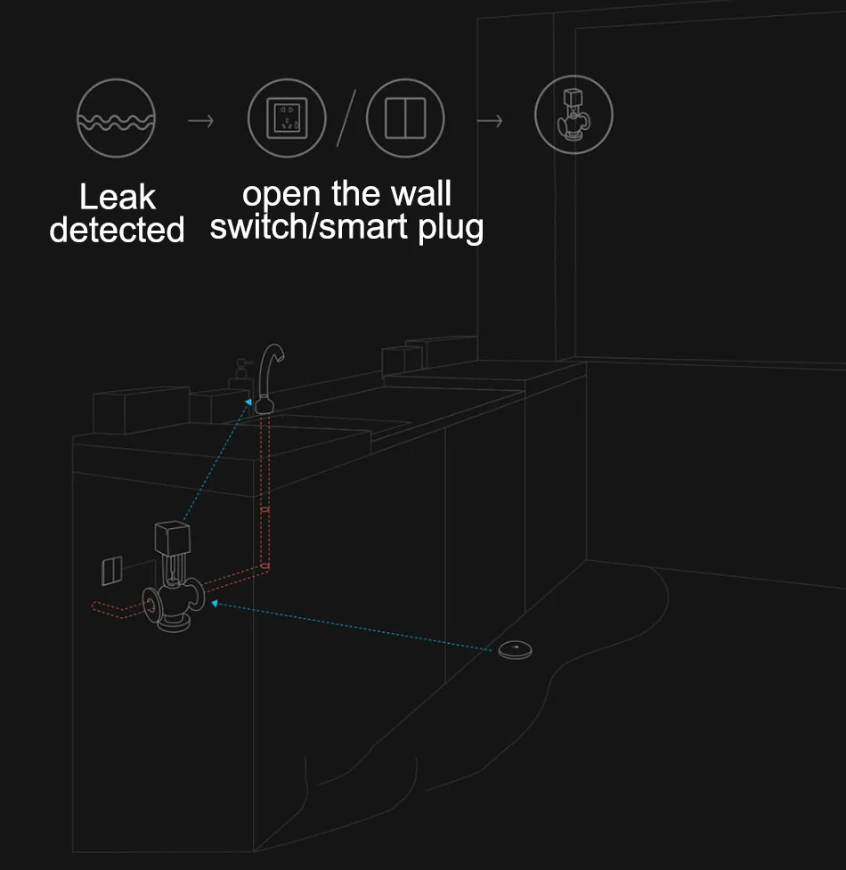 После обнаружения утечки Датчик утечки воды Aqara запускает интеллектуальную вилку Aqara, чтобы мгновенно выключить соленоидный водяной клапан.