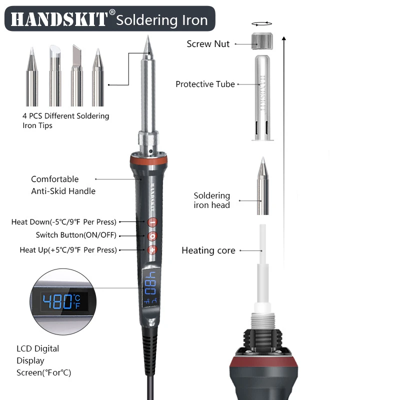 Характеристики:Модель: Handskit- 927Мощность: 200 ВтРежим сна: автоматический сон через 15 минутНапряжение: переменный ток (110 В штепсельная вилка США/220 В штепсельная вилка европейского стандарта)Диапазон температур: 180-480 ℃Стабильность температуры: около 2 ℃Диапазон смещения температуры: около 99 ℃Температурная единица: ℃/FНагреватель: четырехъядерный керамический нагреватель PTCДисплей: синий LE