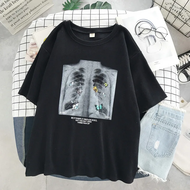 Футболка женская оверсайз в стиле Харадзюку, топ с коротким рукавом и принтом темного черепа, уличная одежда с забавными косточками в стиле панк, топ, женская одежда на лето