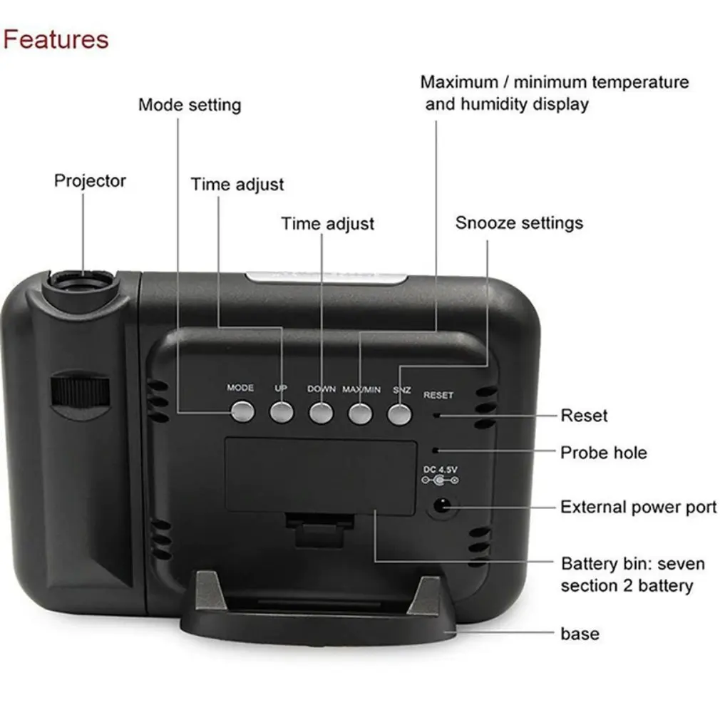 Особенности: 1. Отображение времени (12 часов/24 часа), календаря, дня недели 2. Отображение температуры в помещении (℃ или ℉) и влажности 3. При питании от батарей ЖК-дисплей тусклый для экономии энергии. Светодиодный задний светильник вверх всего 12 секунд после каждого нажатия