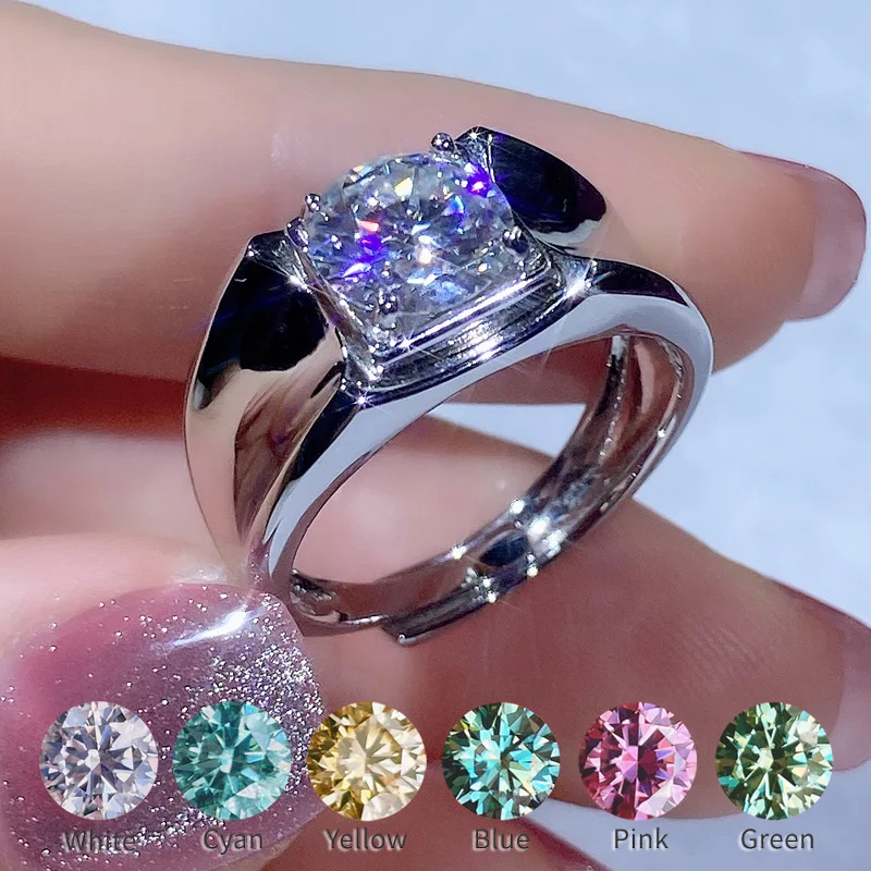 2.0ct бриллиантовое кольцо для мужчин, свадебное бриллиантовое регулируемое кольцо белого, синего, желтого, зеленого цветов, серебро 925 пробы