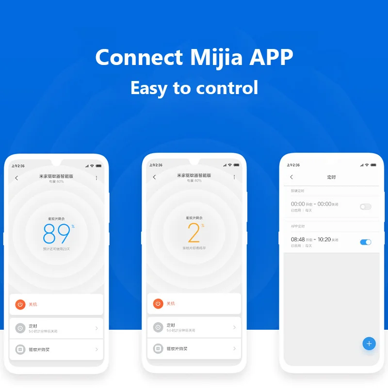 Умное управление через приложение Mijia Этот умный Отпугиватель комаров поддерживает подключение к телефону по bluetooth, в приложении Mijia вы можете легко установить переключатель таймера, проверить срок службы репеллента или питание слева.