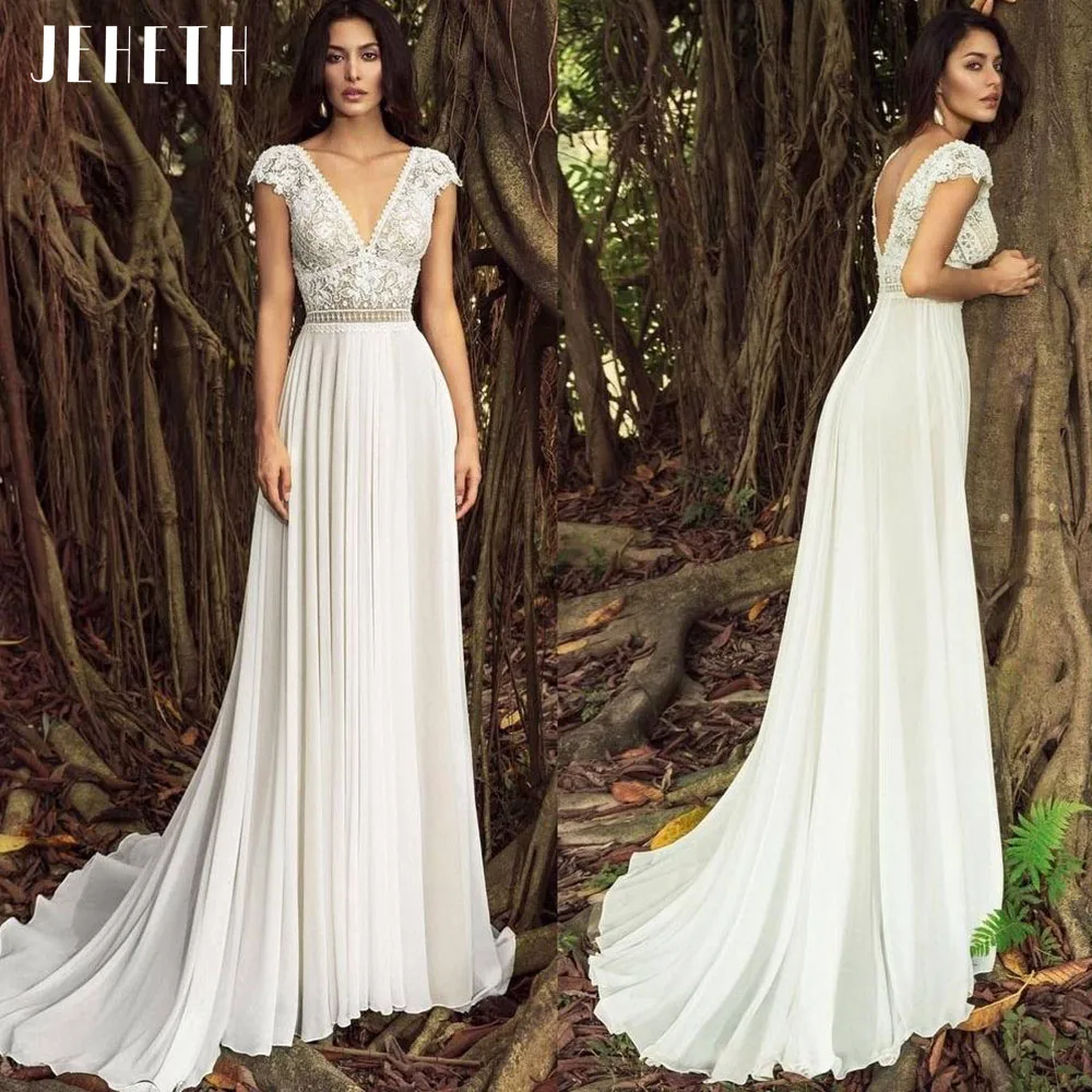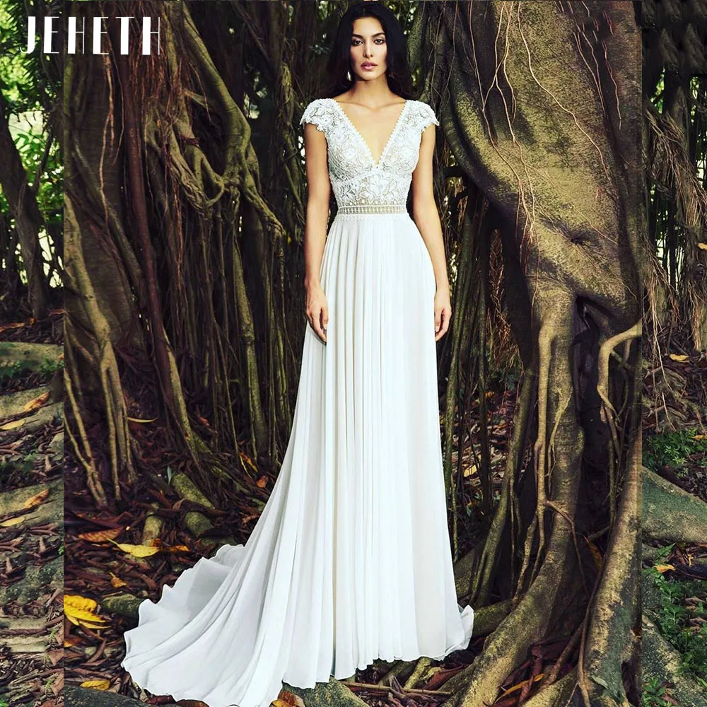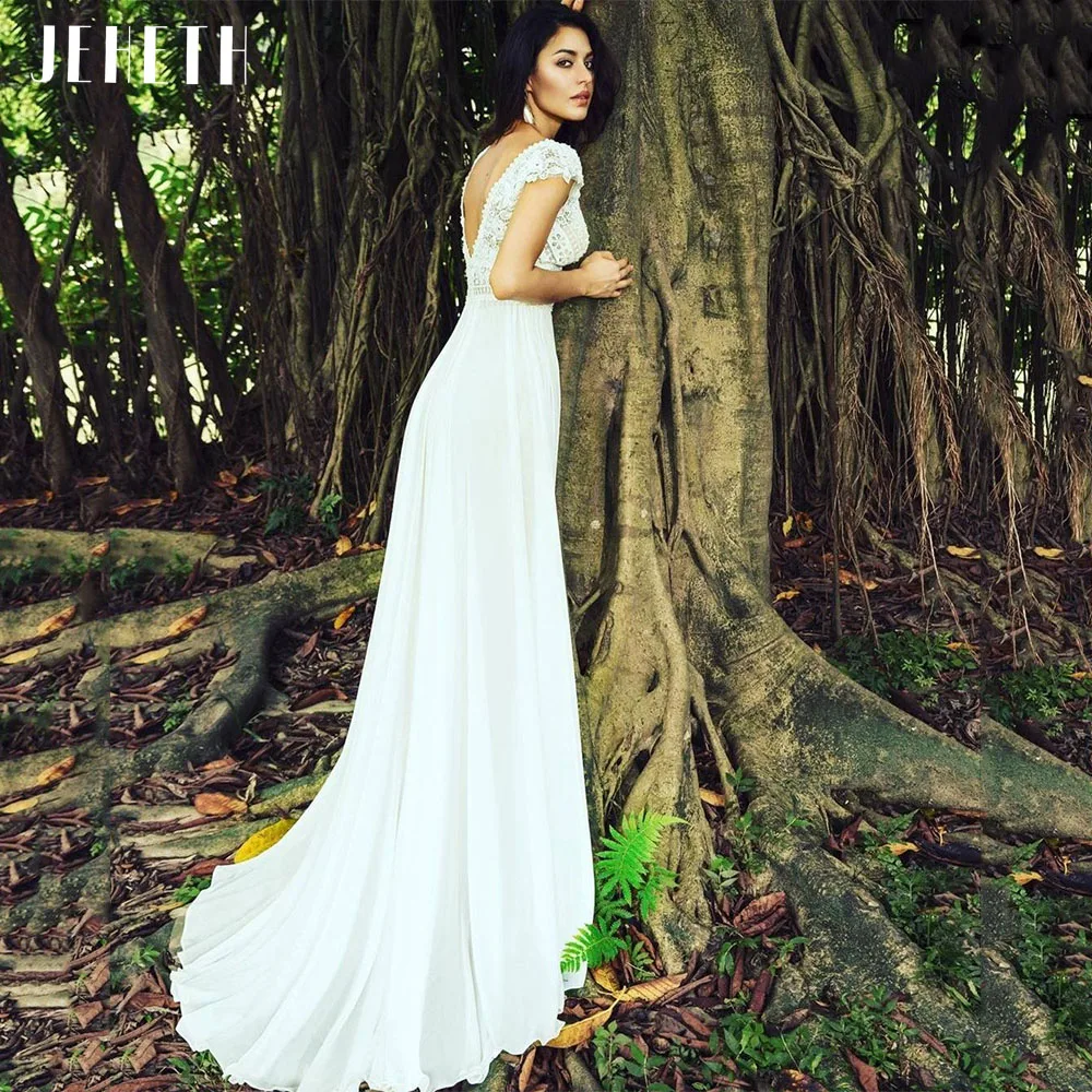 Шифоновое свадебное платье JEHETH в стиле бохо с открытой спиной и V-образным вырезом, кружевное пляжное богемное свадебное платье длиной до пола, женское платье