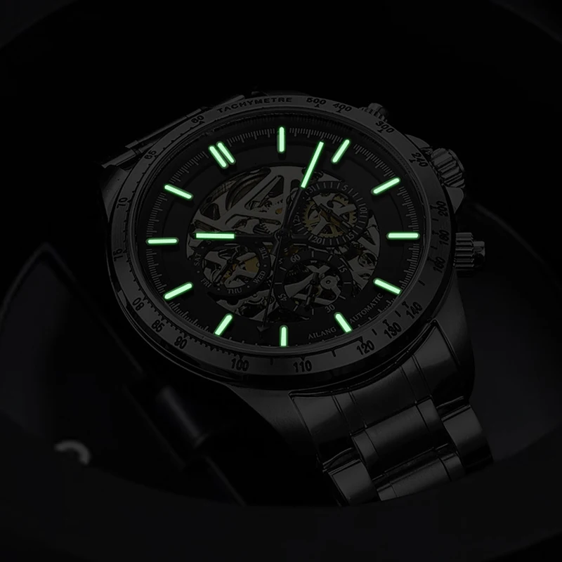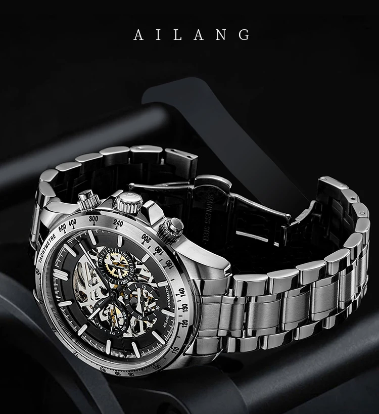 AILANG полностью стальные автоматические механические мужские часы известного бренда, модные светящиеся трехглазые водонепроницаемые полые часы в стиле стимпанк 8827B