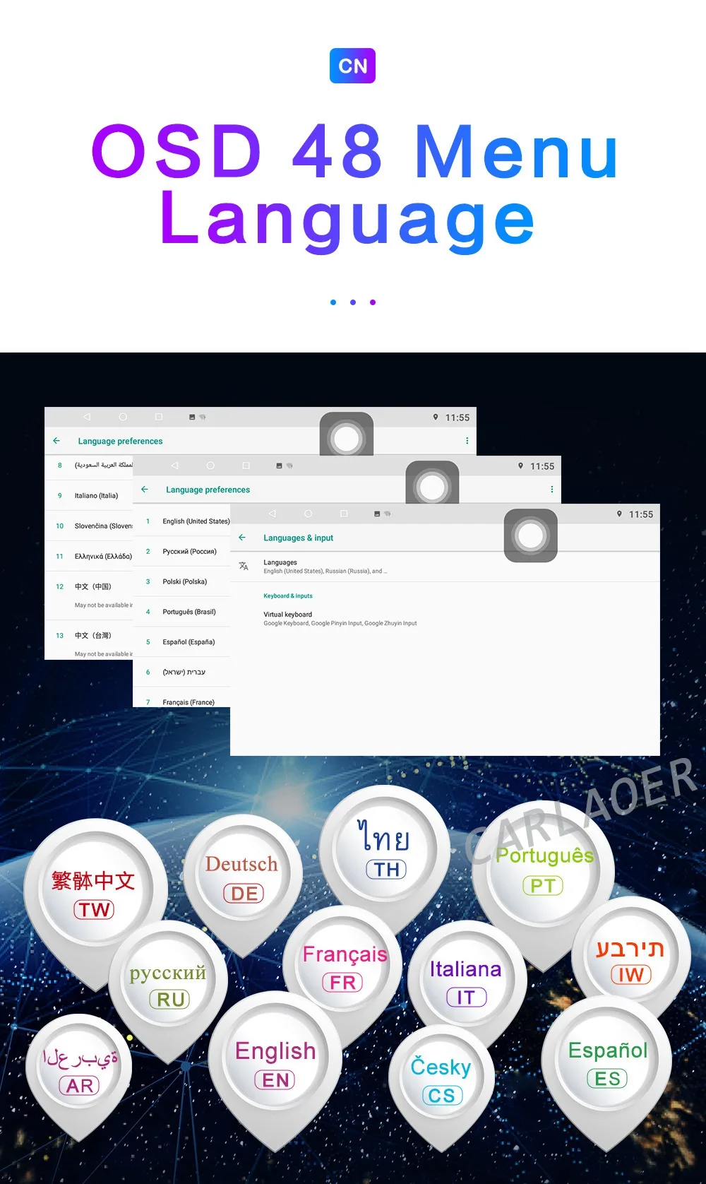 Языки с множеством экранных меню: китайский (упрощенный), русский, испанский, турецкий, русский, иврит, итальянский, китайский (традиционный), арабский, французский, немецкий, английский, португальский, 48 языков, включая корейский, Таиланд и т. Д.Поддержка USB DVR (опционально)DAB + Поддержка (опционально)Поддержка TMPS (опционально)Поддержка OBD (опционально)