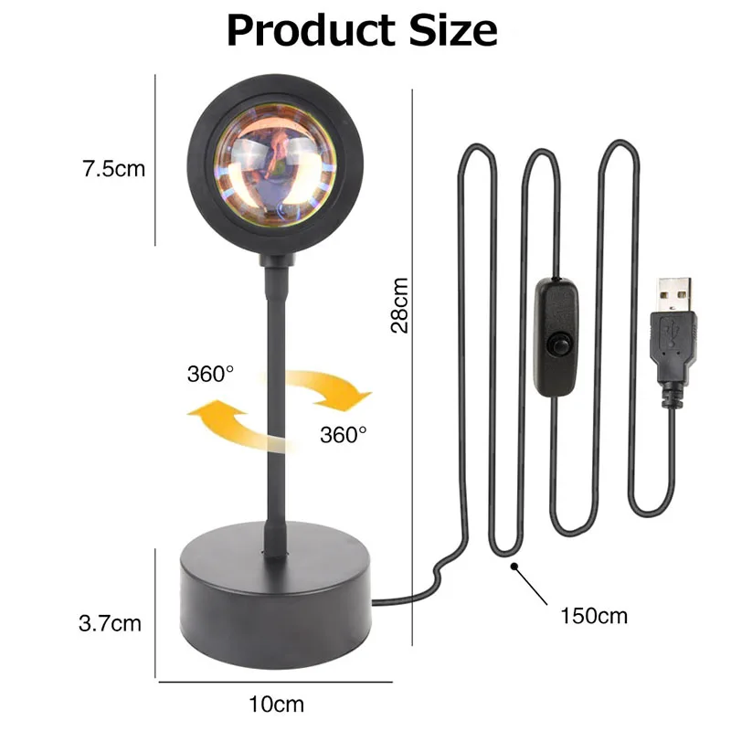 1. Название продукта: светодиодный светильник заката, проекционный окружающий светильник2. Режим питания: usb-разъем3. Входное напряжение: 5 В4. Тип источника: светодиодный светильник5. Мощность продукта: 5 Вт6. Материал держателя лампы: пластик-Плакированный Алюминий (корпус ABS со встроенным радиатором)7. Материал Шланга металлический шланг + черный силиконовый рукав8. Основной Материал: АБС-пластик9. Метод управления: переключатель управления проводом10. Шнур питания составляет около 1,5 метров в длину