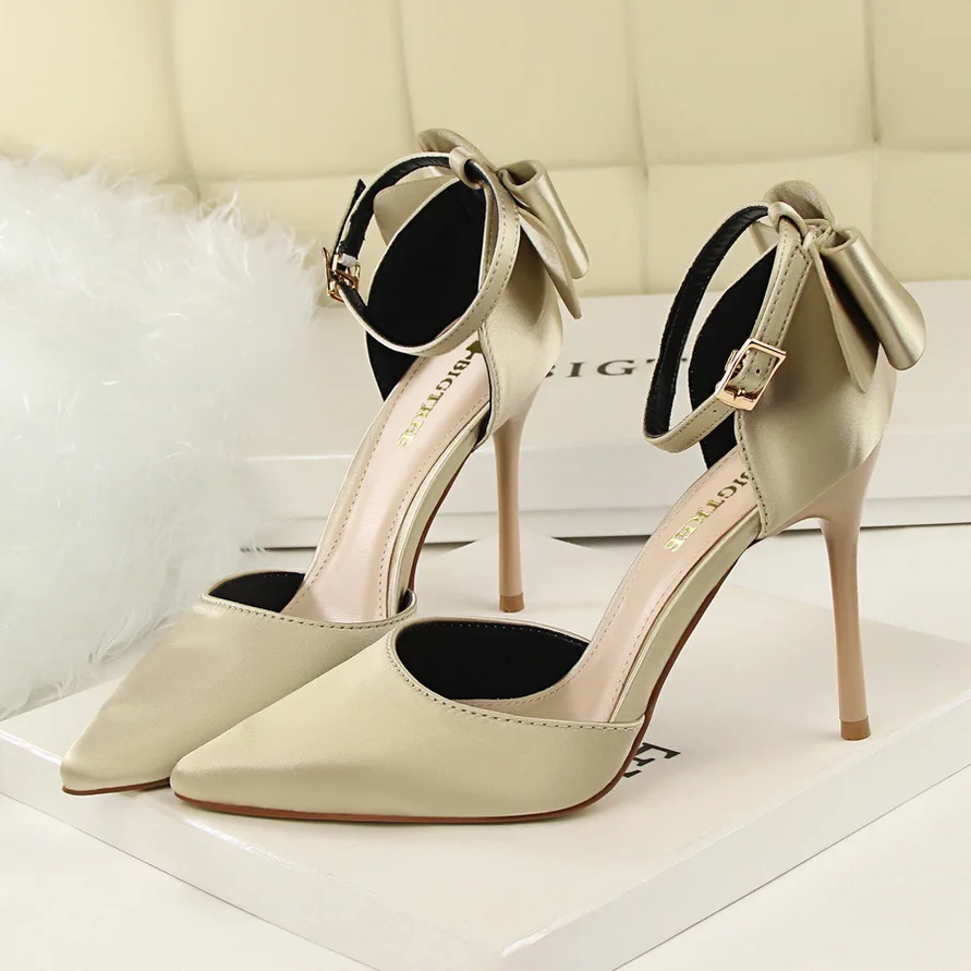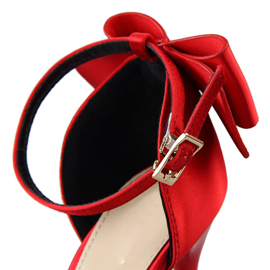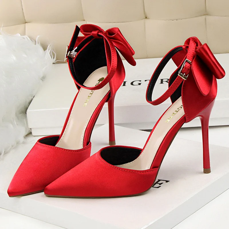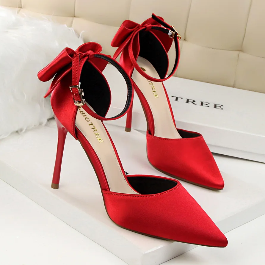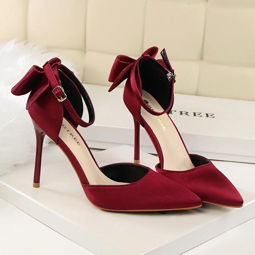Женские босоножки на высоком каблуке 10 см, атласные шелковые бордовые туфли-лодочки с бантом-бабочкой, красные туфли с острым носком для невесты, большие размеры, лето 2022