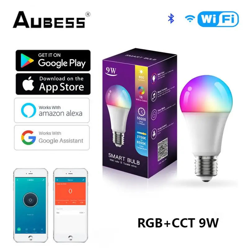 Смарт светильник ПА светодиодная AUBESS, 9 Вт, WiFi, Bluetooth, B22, E27, RGB, работает с AlexaGoogle Home, 85-265 в