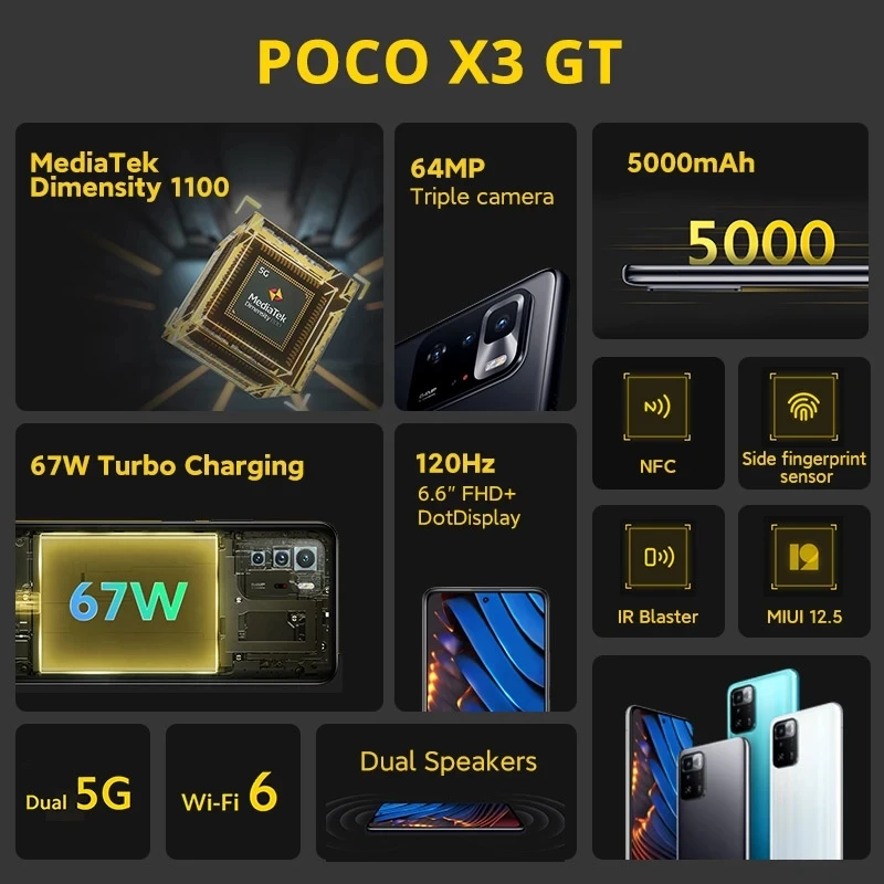 Смартфон глобальная версия POCO X3 GT, 128 ГБ256 ГБ, 1100 дюйма, 120 мАч, 64 мп