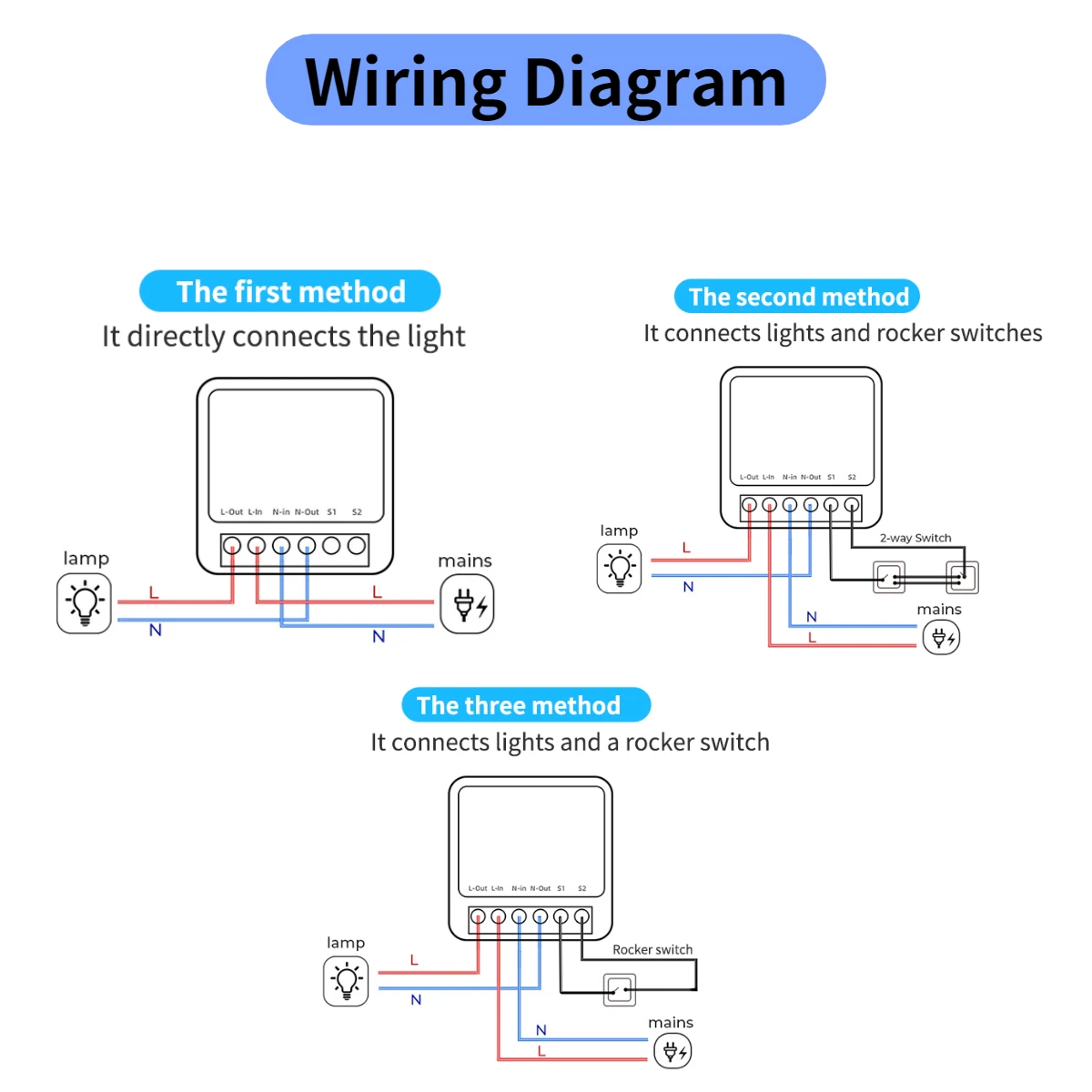 Проводка: S1 и S2 можно подключить только к двум концам настенного выключателя. И не может быть подключен к сильной мощности, такой как линия нулевого огня (устройство должно питаться от L и N)