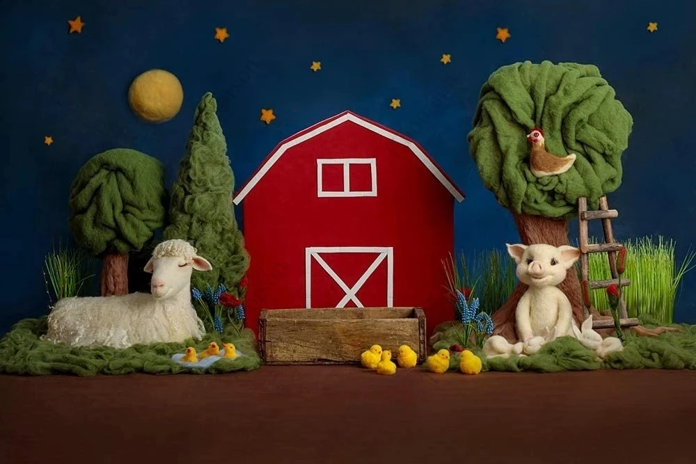 Виниловый фон для фотосъемки новорожденных с изображением Красного дома и животных