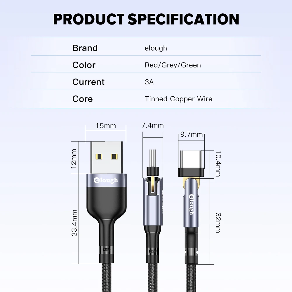 Зарядный USB-кабель Elough, вращающийся на 180 градусов, Тип C, Micro USB, зарядное устройство для Xiaomi, Samsung 3A, быстрая зарядка 3,0, кабель для быстрой зарядки, шнур для передачи данных и игр