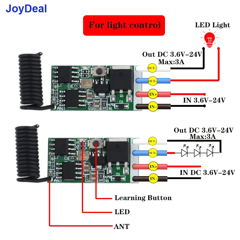 После очистки кода весь пульт дистанционного управления больше не может работать.Изучение кода: (мгновенный)Нажмите кнопку обучения на приемнике один раз, он приходит в мгновенный режим настройки.Подождите немного, светодиодный индикатор включится, он войдет в состояние обучения.Нажмите кнопку дистанционного управления, светодиодный индикатор на плате приемника будет мигать 3 раза, а затем выключаться,Обучение успешно.Изучение кода: (переключение)Нажмите кнопку обучения на приемнике дважды, он приходит в режим переключенияПодождите немного, светодиодный индикатор включится, он войдет в состояние обучения.Нажмите кнопку дистанционного управления, светодиодный индикатор на плате приемника будет мигать 3 раза, а затем выключаться,Обучение успешно.Изучение кода: (фиксация)Примечание: Когда вы выбираете режим блокировки, для того, чтобы узнать больше дистанционного управления, вам нужно узнать две разные кнопки, первый раз изучен для «ON», второй раз узнал для «OFF».Например: Кнопка A = ON, кнопка B = OFFНажмите кнопку обучения на приемнике в три раза, он переходит в режим фиксации.Подождите немного, светодиодный индикатор на плате приемника будет включен,Нажмите кнопку дистанционного управления A,Светодиодный фонарик 3 раза.Нажмите кнопку дистанционного управления B.Светодиодный индикатор мигает 3 раза, а затем выключается,Обучение успешно.A = ON , B = OFF.Изучение кода: (режим задержки времени)Нажмите кнопку обучения на приемнике вперед время, время в течение 5 секунд.Нажмите клавишу обучения на приемнике в пятый раз, время задержки в течение 10 секунд.Нажмите клавишу обучения на приемнике в шестом раз, время задержки в течение 15 секунд.