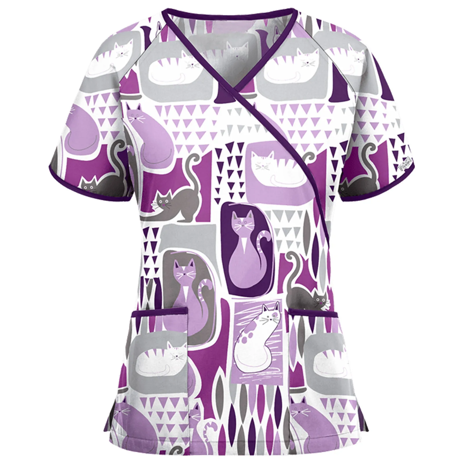 Женская милая рубашка с принтом животных, топы для медсестер, Повседневная рубашка с коротким рукавом и v-образным вырезом, школьная форма, блузка для медсестры, женские топы-скрабы