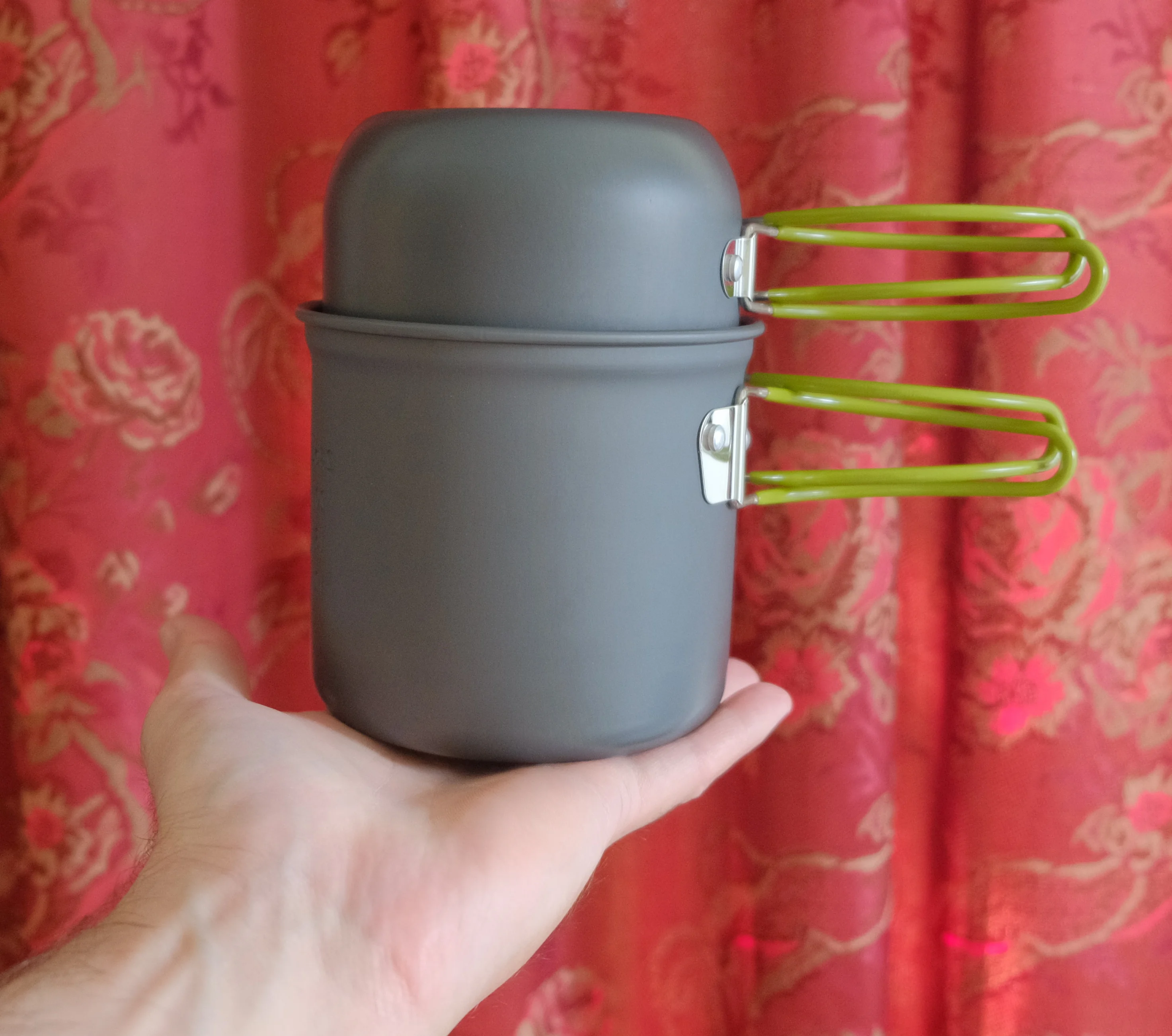 Качество продукции хорошее, легкий, общий вес 260 грамм, на фото указал, по объему сама кастрюлька для комфортного приготовления вмещает 900 мл, крышка чаша 400 мл, всё что больше под край уже, на костре, или щепочнице, готовить не рекомендую, ручки силиконовые, сгорят, только на газовой горелке.