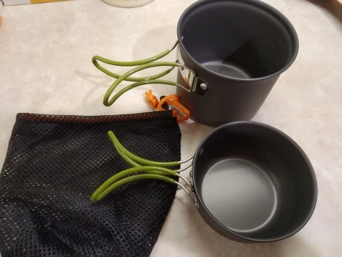 Отличные котелки, легкие. Ручки удобные, фиксируются хорошо в раскрытом положении. Чехол очень прочный, из толстой сетки. Осталось в походе испробовать
