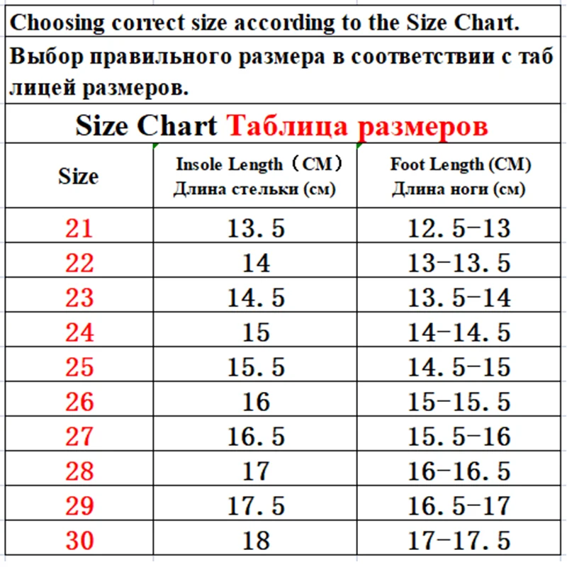 Дорогие друзья: Поскольку все размеры детской обуви отличаются, при заказе детской обуви вы должны соответствовать нашим размерам и внутренней длине. Согласно длине стельки. (длина стельки = длина стопы + 1 см) Размер не стандартный, просто удобно для вас сделать заказ. Удобная длина стопы составляет около 1 см. И из-за длительного времени доставки ребенок быстро вырастет, пожалуйста, выберите обувь большего размера для вашего ребенка. Пожалуйста, выберите правильный размер. Вся обувь будет отправлена с пузырчатыми сумками, без коробок! 50 лучших клиентов в магазине получат таинственный маленький подарок каждый день.