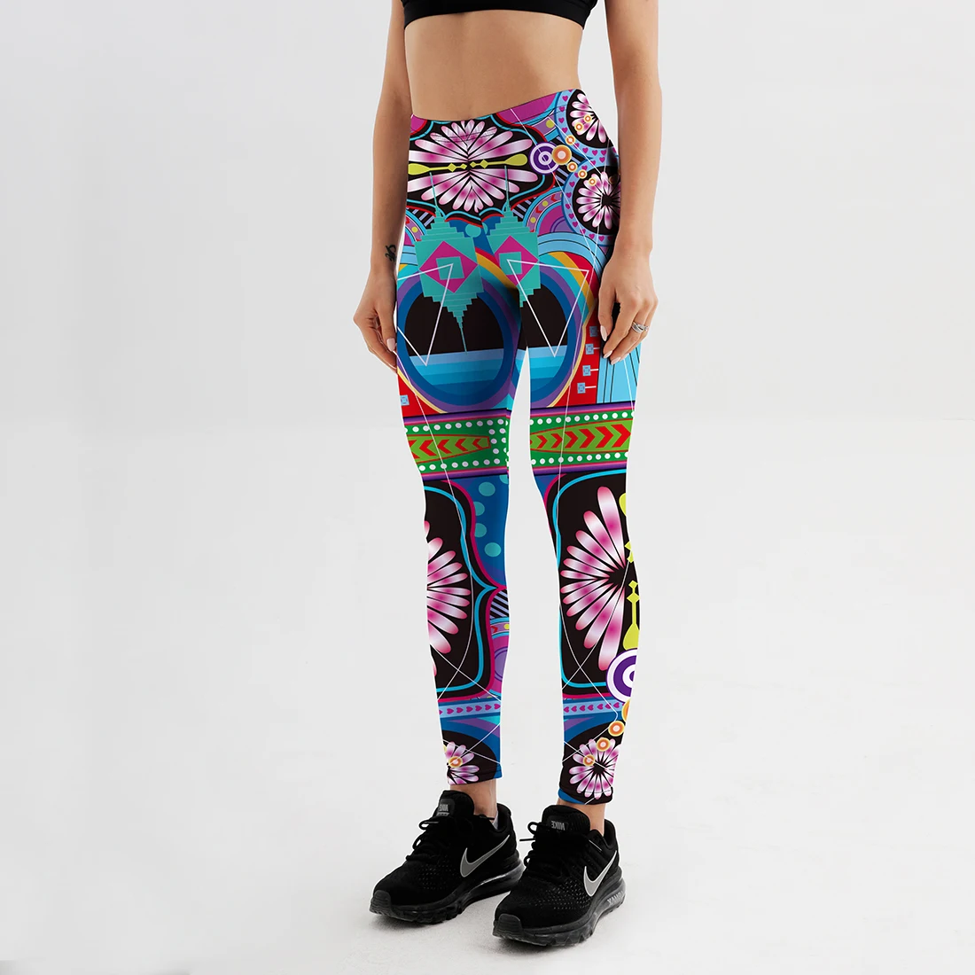 Леггинсы женские, черные, с цветочным принтом, с высокой талией
