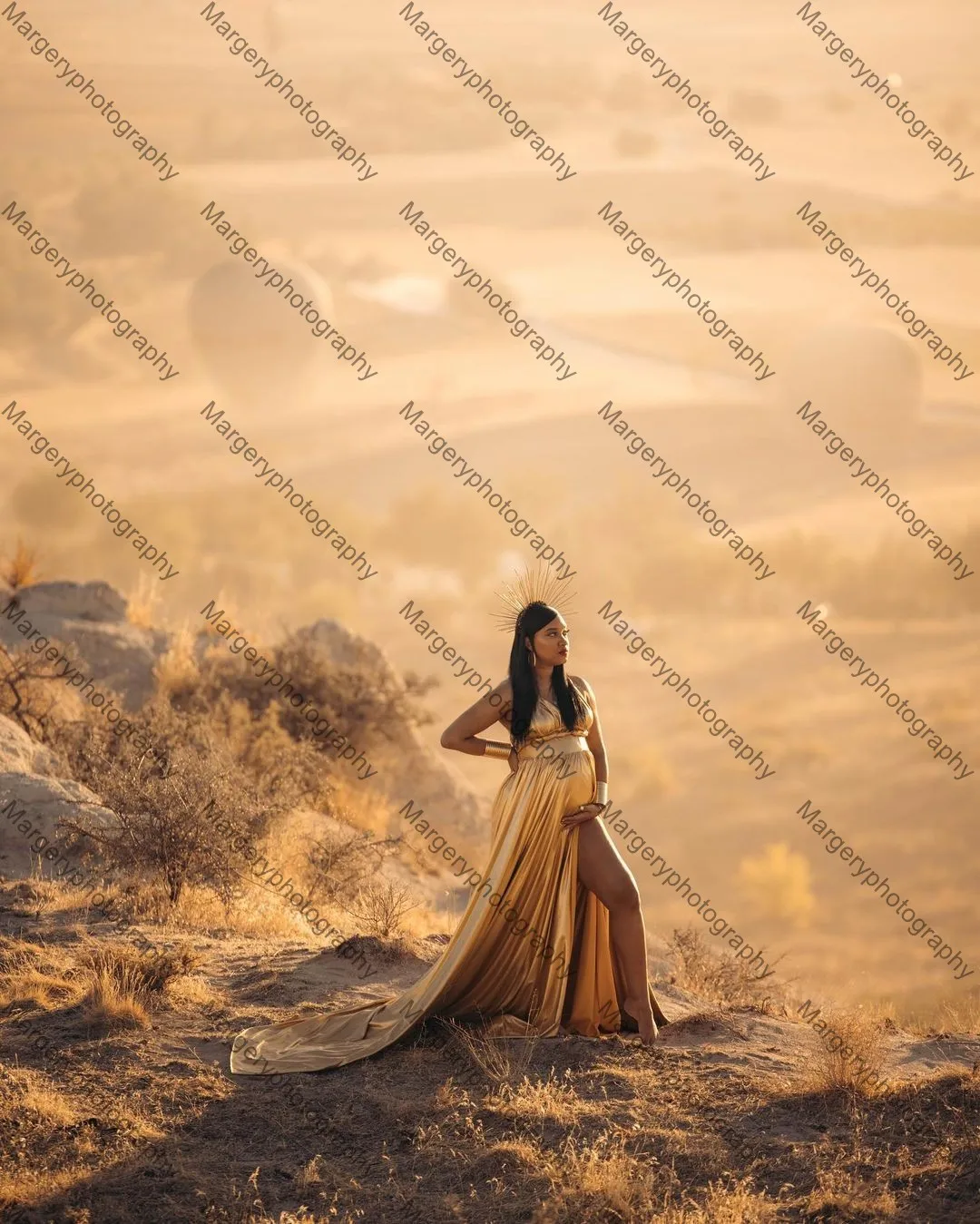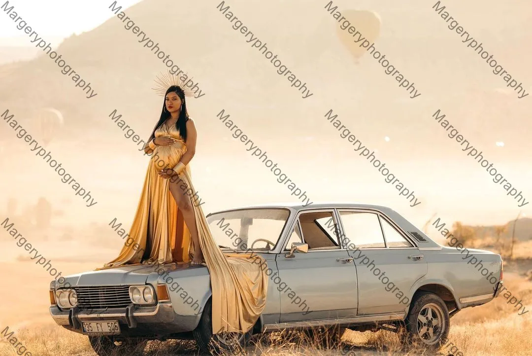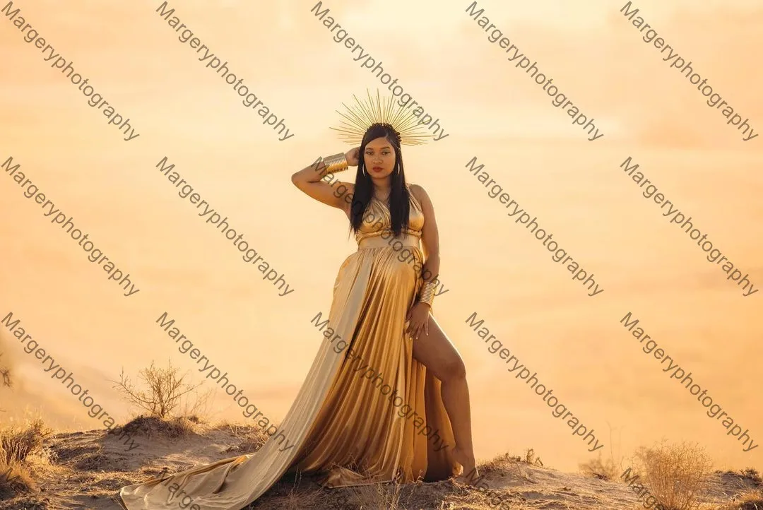 Уникальное Золотое атласное длинное платье для беременных женщин шикарные платья с V-образным вырезом и Боковым Разрезом для беременных со шлейфом