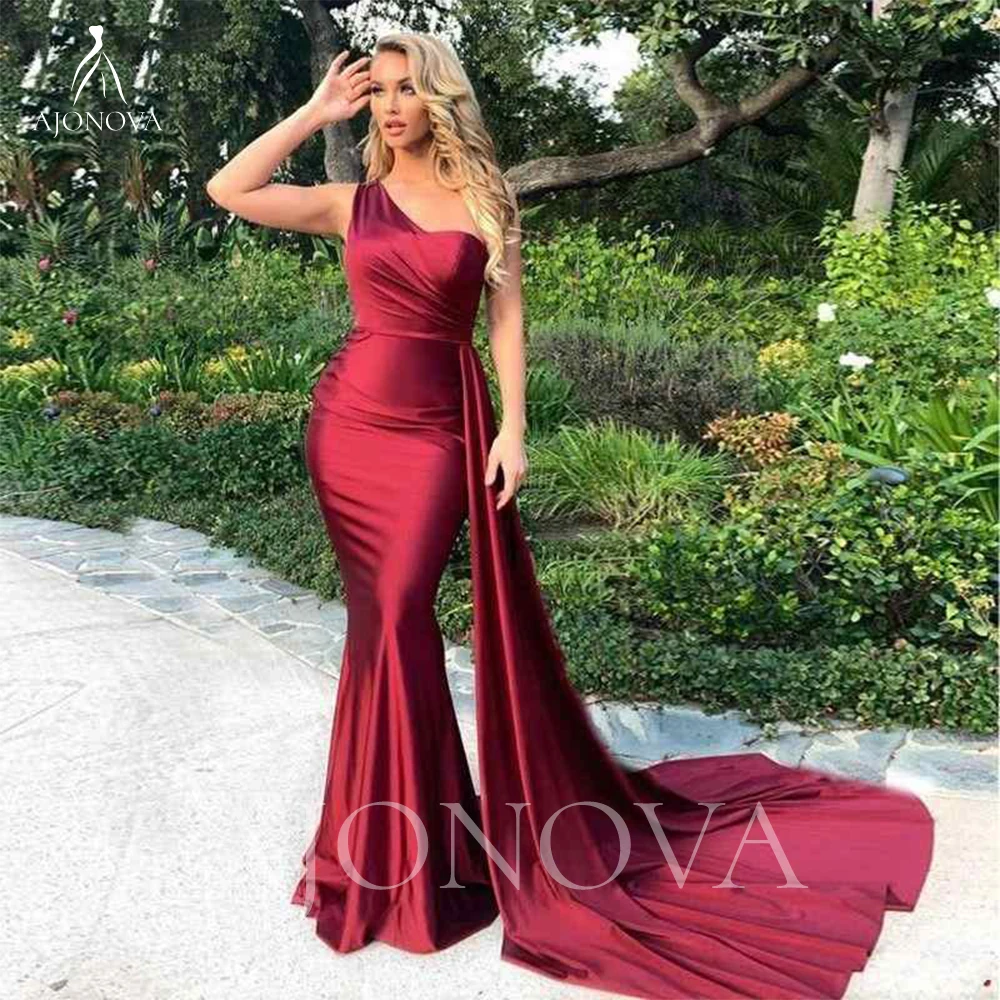 Простые бордовые атласные вечерние платья на одно плечо женское пла...
