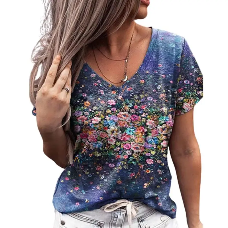 Женская футболка с цветочным принтом, свободного кроя, с коротким рукавом и V-образным вырезом