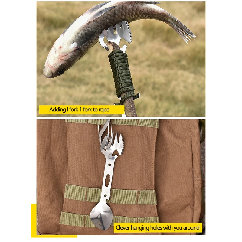 Функция: ложка, вилка, зубчатое лезвие, открывалка для бутылок, отверстие для веревки harpoon, консервный нож,