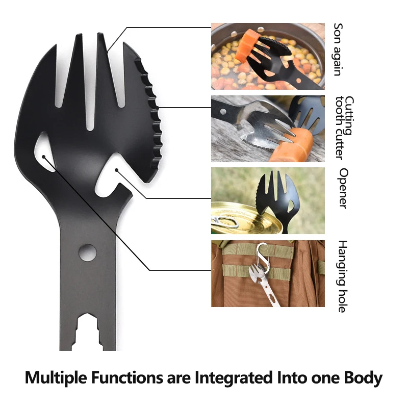 1. Открытый многофункциональный инструмент с консервным баком и открывалкой для бутылок, ложкой, вилкой, идеально подходит для активного отдыха.