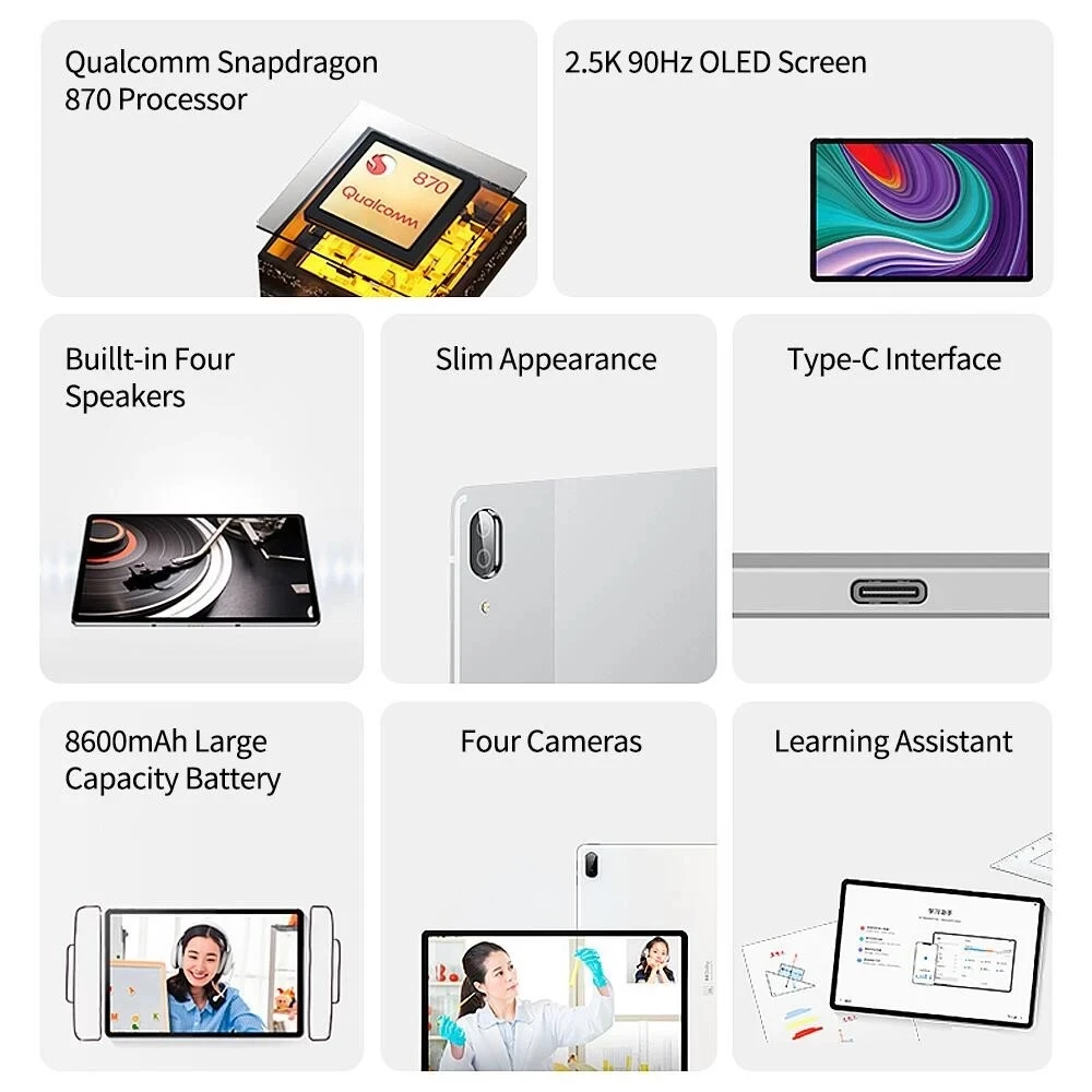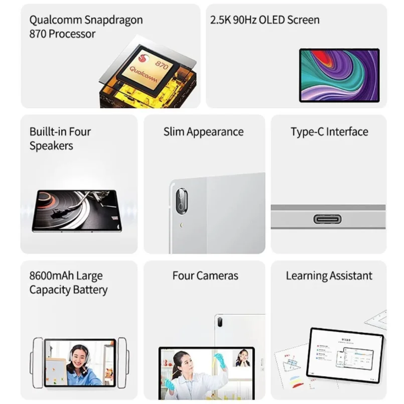 Особенности:Принять устройство, док-станция Qualcomm Snapdragon 870 восьмиядерному процессору, 7nm процесс ядра, основная частота до 3,2 ГГц, быстрее и более плавная работа.11,5 дюймов OLED глаз защитная пленка, 2560*1600 разрешение, 100% DCI-P3 цветовой гаммы, вы можете увидеть больше деталей изображения. Частота обновления 90 Гц, быстрая съемка, обеспечивает плавное зрение.Оснащен 6 ГБ LPDDR5 памяти + 128 ГБ UFS 3,1 флэш-памяти, быстрый отклик.Высокопрочный алюминиевый сплав оболочки, ЧПУ исполнение интегрированная формовка производственный толщина принта по операциям всего 5,8 мм, легко носить с собой и использовать.Встроенный четыре колонки, каждый из них имеет 1,5 W высокая мощность и 2.5CC большой канал звуковой камеры, поддерживает Dolby ATMOS звуковой эффект, лучшее качество звука.Четыре камеры дизайна, две фронтальные камеры + Тоф могут реализовать функцию разблокировки лица, и планшет может быть разблокирован по отпечатку пальца с помощью кнопки питания, более удобным в использовании. Задние Двойные камеры и широкоугольный объектив 120 ° отображают более подробную информацию.Встроенный аккумулятор большой емкости 8600 мАч, поддержка быстрой зарядки QC 3,0, сокращение времени ожидания, идеально подходит для ежедневного использования.Спецификация:Бренд: LenovoМодель: Xiaoxin Pad Pro 2021Цвет: серебристыйСетевой режим: WiFiПроцессор: Qualcomm Snapdragon 870Операционная система: Android 11Экран: 11,5 дюймов, 2560*1600, OLED, 90 Гц, 420 нитПамять: 6 ГБ + 128 ГБКамера: Передняя 8 МП FF RGB + 8 МП FF IR, задняя 13 МП AF + 5 МП FF(120 ° широкоугольный) фонарикБеспроводная передача данных: 802.11a/b/g/n/ac, 2,4 ГГц и 5 ГГцBT: BT5.1Интерфейс: Type-C 3,1, слот для tf-карты, POGO Pin * 4Аудио: 4 * боковой динамик, звуковой эффект DOLBY ATMOS, 2 * микрофон (средний)Сенсор: g-сенсор, Тоф, l-сенсор, компас, гироскоп, датчик холла, вибромоторЕмкость аккумулятора: 8600 мАчМощность адаптер: 20 Вт (10V, 2A), QC3.0Размер изделия: 26,43*17,14*0,58 См/10,41*6,75*0,23 дюймаВес изделия: прибл. 485 г/17,11 унцийУпаковочный лист:1 * планшет1 * Адаптер питания1 * кабель для передачи данных1 * Руководство пользователя