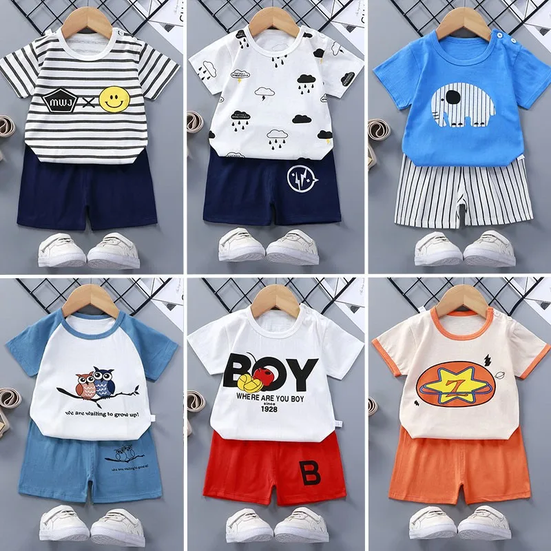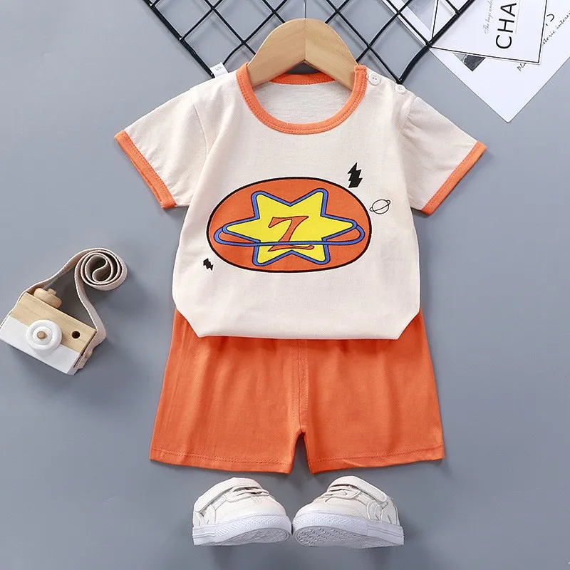 Летний костюм с коротким рукавом для мальчиков и девочек, повседневная одежда, модная футболка с мультяшным рисунком и шорты для малышей, комплект из 2 предметов, чистый цвет