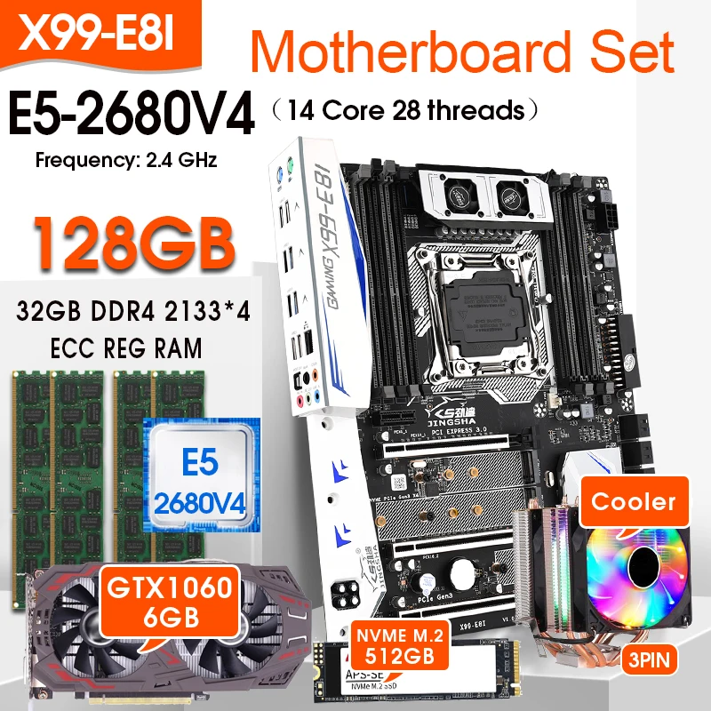 X99-E8I материнская плата combos E5 2680V4 процессор 4 шт. 32 Гб 2133 = 128 ГБ ECC память 512 ГБ M.2 SSD GTX1060 6 ГБ + охладитель