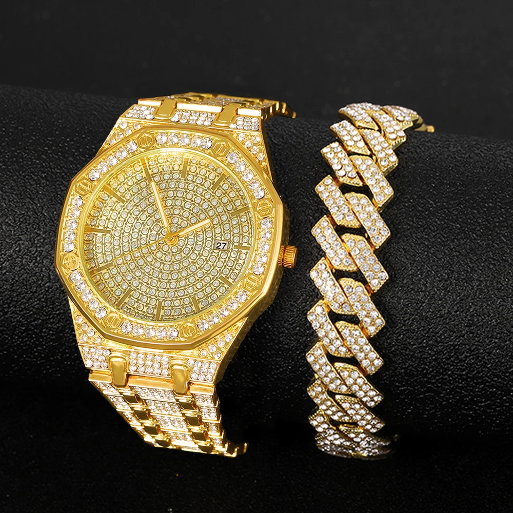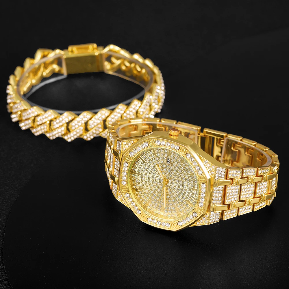 Мужские часы с браслетом и цепочкой, золотые часы в стиле хип-хоп