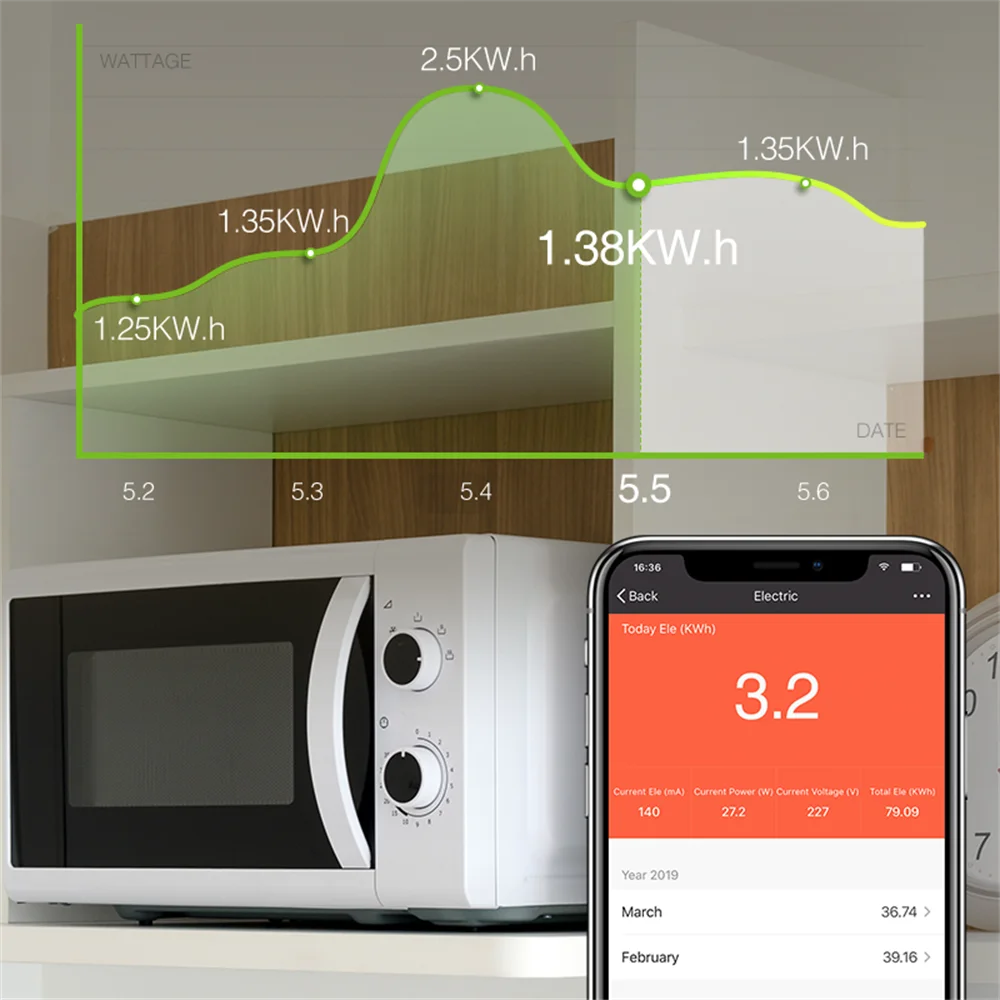 【Измеряет потребление энергии 】 штепсельные вилки Gosund Smart Home измеряют потребление энергии, а также поддерживают долгосрочную запись благодаря их внутреннему измерителю потребления энергии. Наши WiFi вилки поддерживают максимальный ток 16 А и максимальную мощность 3680 Вт. Вы можете четко видеть, сколько энергии было использовано высокомощными устройствами в приложении Gosund. Помогает вам идентифицировать «устройства вампира».