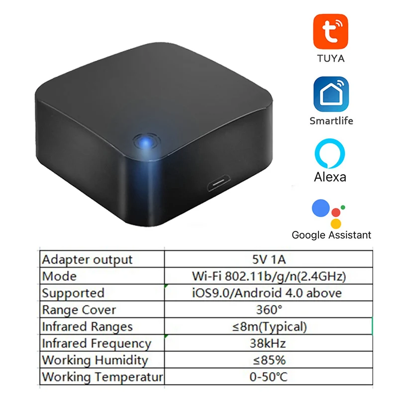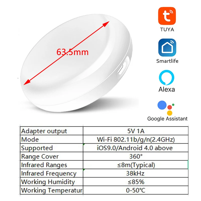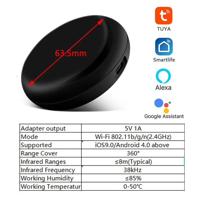 Совместим с Alexa/Echo, Google Home для голосового управления вашим телевизором, STB, кондиционером и вентиляторами. Устройство поддерживает только 2,4G WiFi.