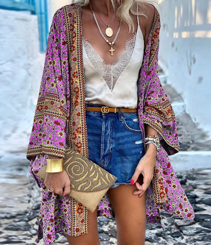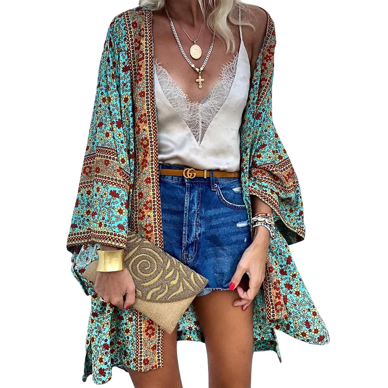 Женский кардиган с открытым спереди, летняя богемная блузка с цветочным принтом, кимоно, повседневные свободные пляжные топы, винтажные с длинным рукавом