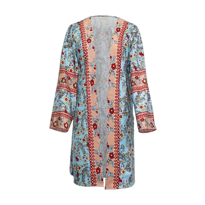 Женский кардиган, Летняя Открытая спереди богемная блузка с цветочным принтом, кимоно, повседневные свободные пляжные топы, Винтажный Длинный Рукав