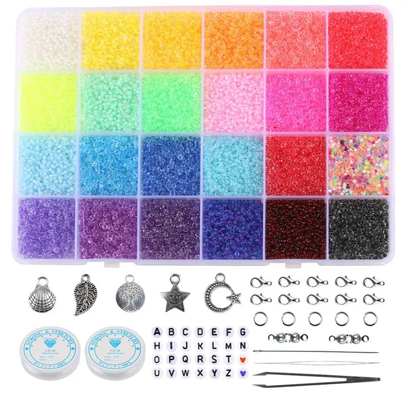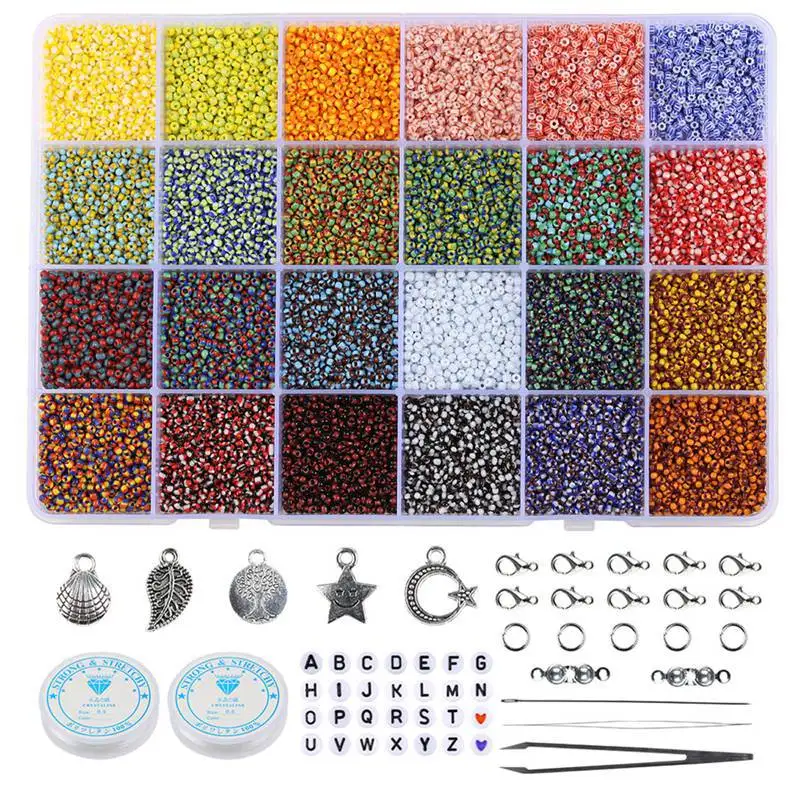 В том числе:24 цвета 16000 шт 2 мм бисер + аксессуарыСумка для аксессуаров4*7 мм буквы бусинки 260 штA-Z каждой английской буквы/10 шт.4*7 мм сердечные бусины 10 шт10 шт. застежка-лобстер50 шт открытая петля50 шт. застежка для сумки2 рулона струны5 шт кулон из сплаваПинцет 1 шт.
