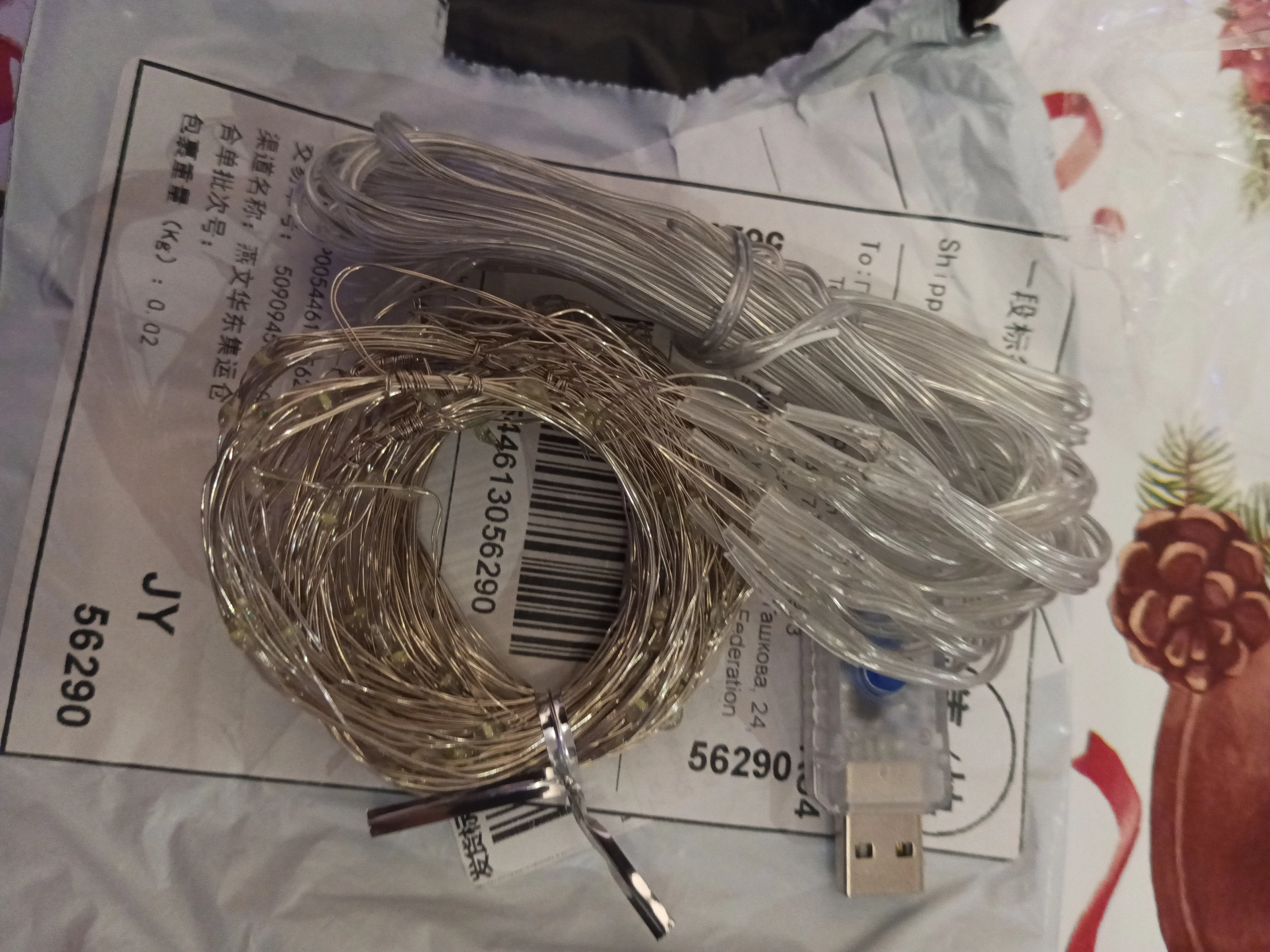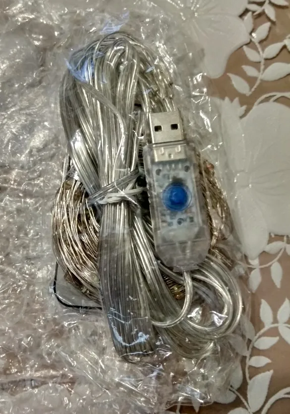 прислали в срок. светодиоды на проволоке. чтобы висели ровно, привязала грузик за кончики. в пульт подошла круглая батарейка 2016. направлять нужно точно на переключатель, где usb вход. гирлянду видно и днём и ночью. яркая, легкая, все режимы работают. рекомендую