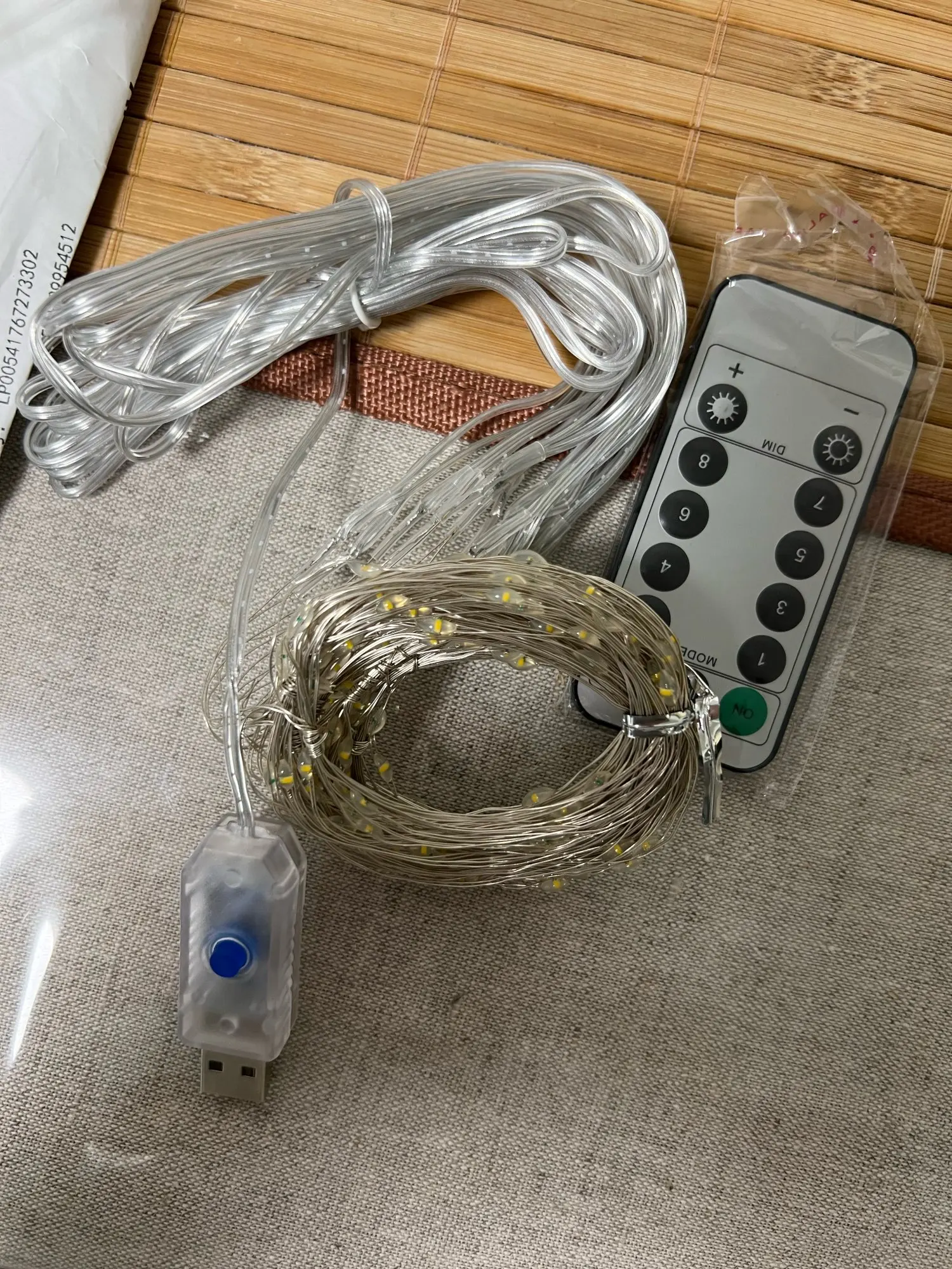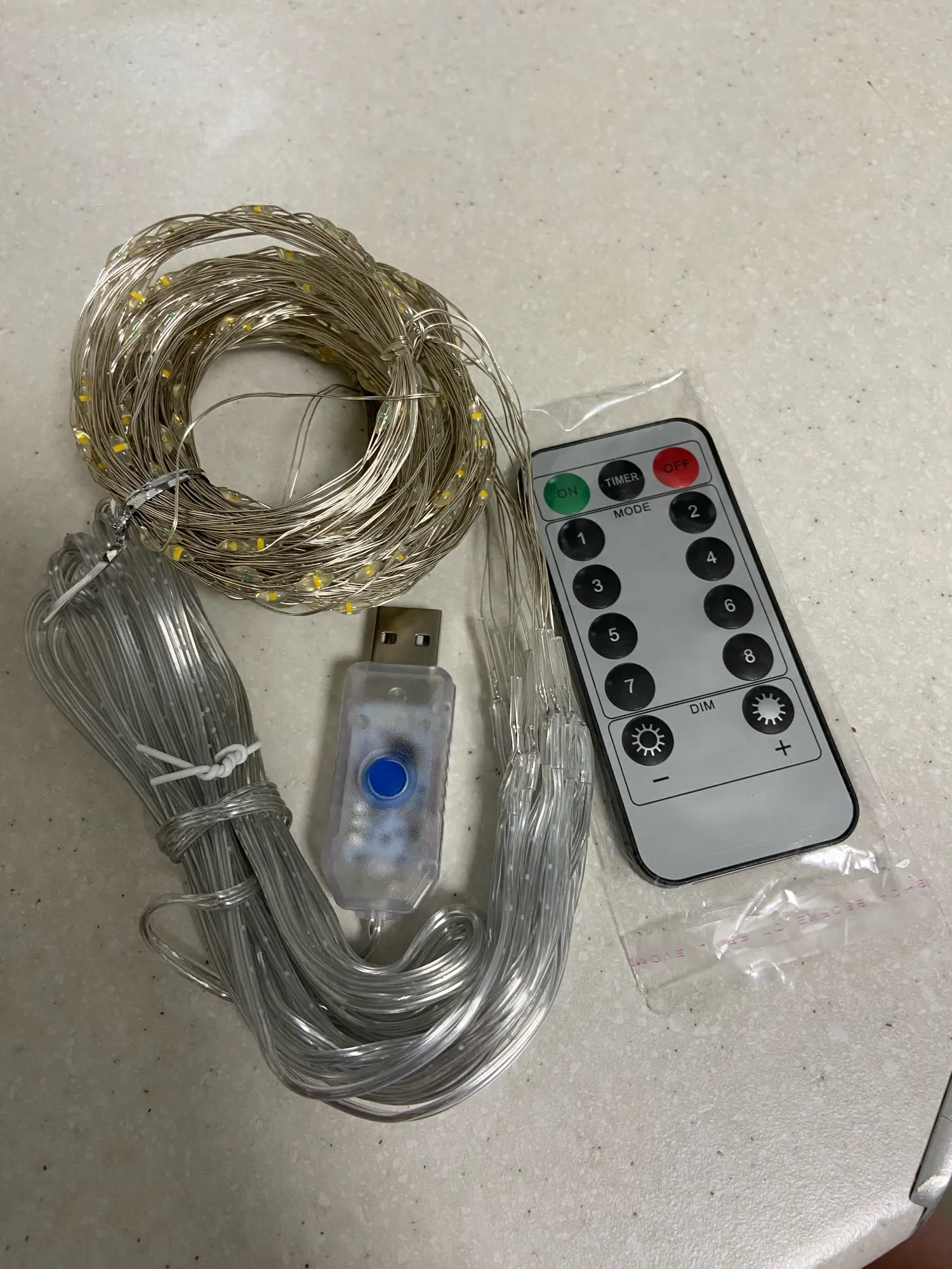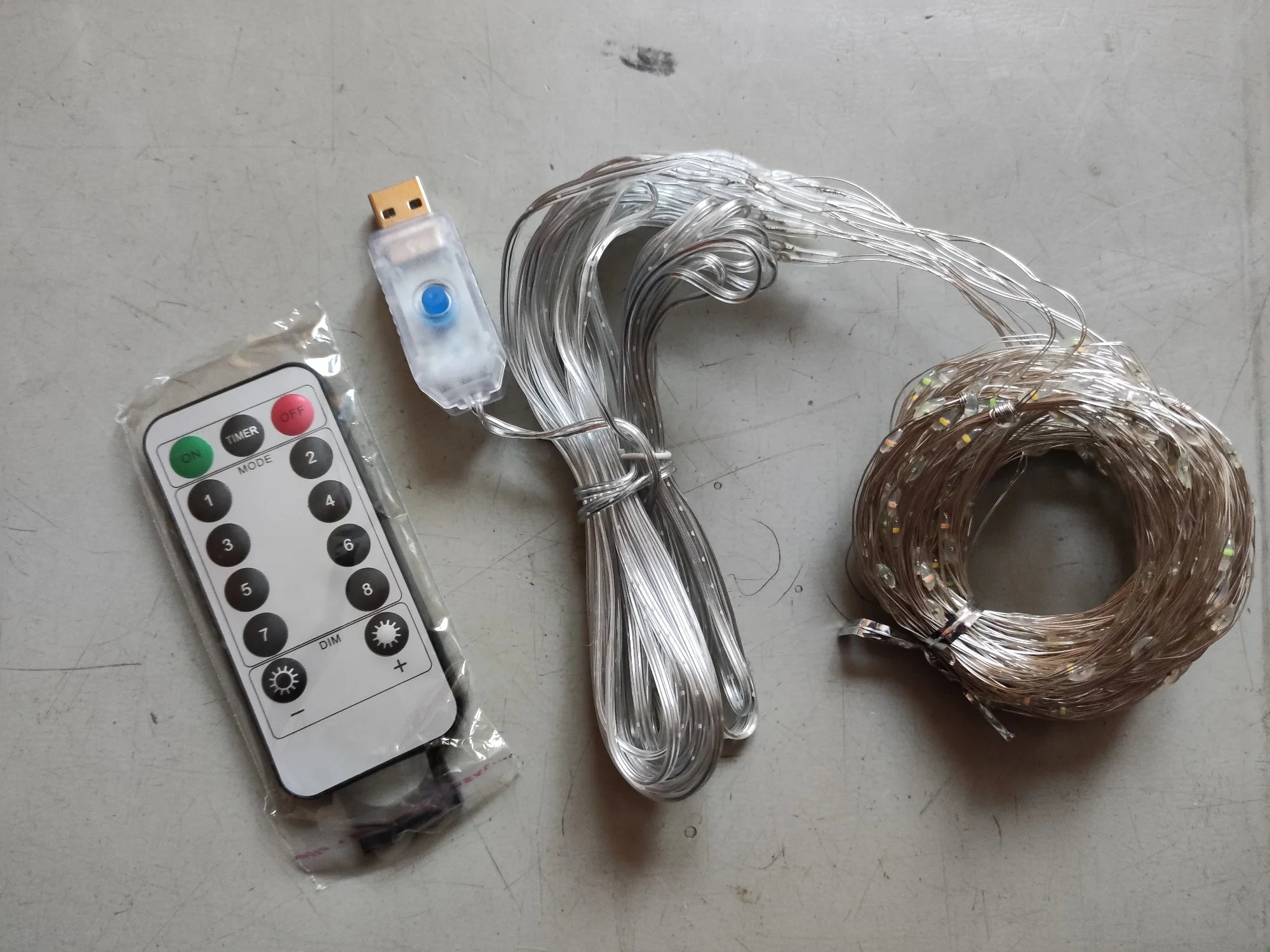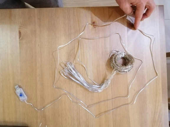 Гирлянда пришла быстро. Работает от зарядки USB, кнопка на штекере переключает режимы. Ниточек из тонких светодиодов в занавесе всего 10, т.е. расположены примерно через 30 см. Сложили вдвое со сдвигом, получилось через 15. Ниточки свиты в кольца, провод достаточно жесткий расправить в вертикальные линии реально только с прикрепленным грузом. Пульт без батарейки, но особо и не нужен.