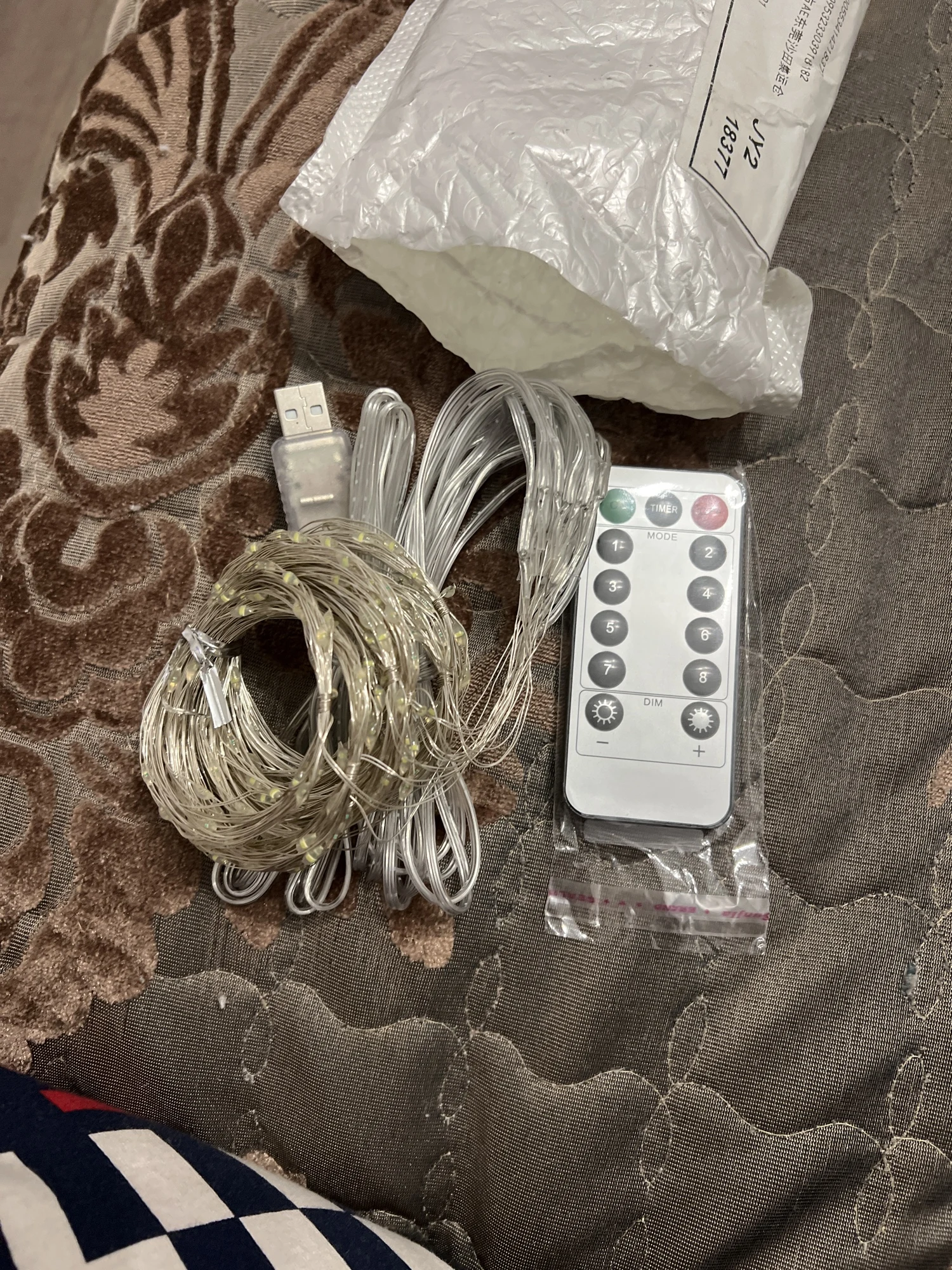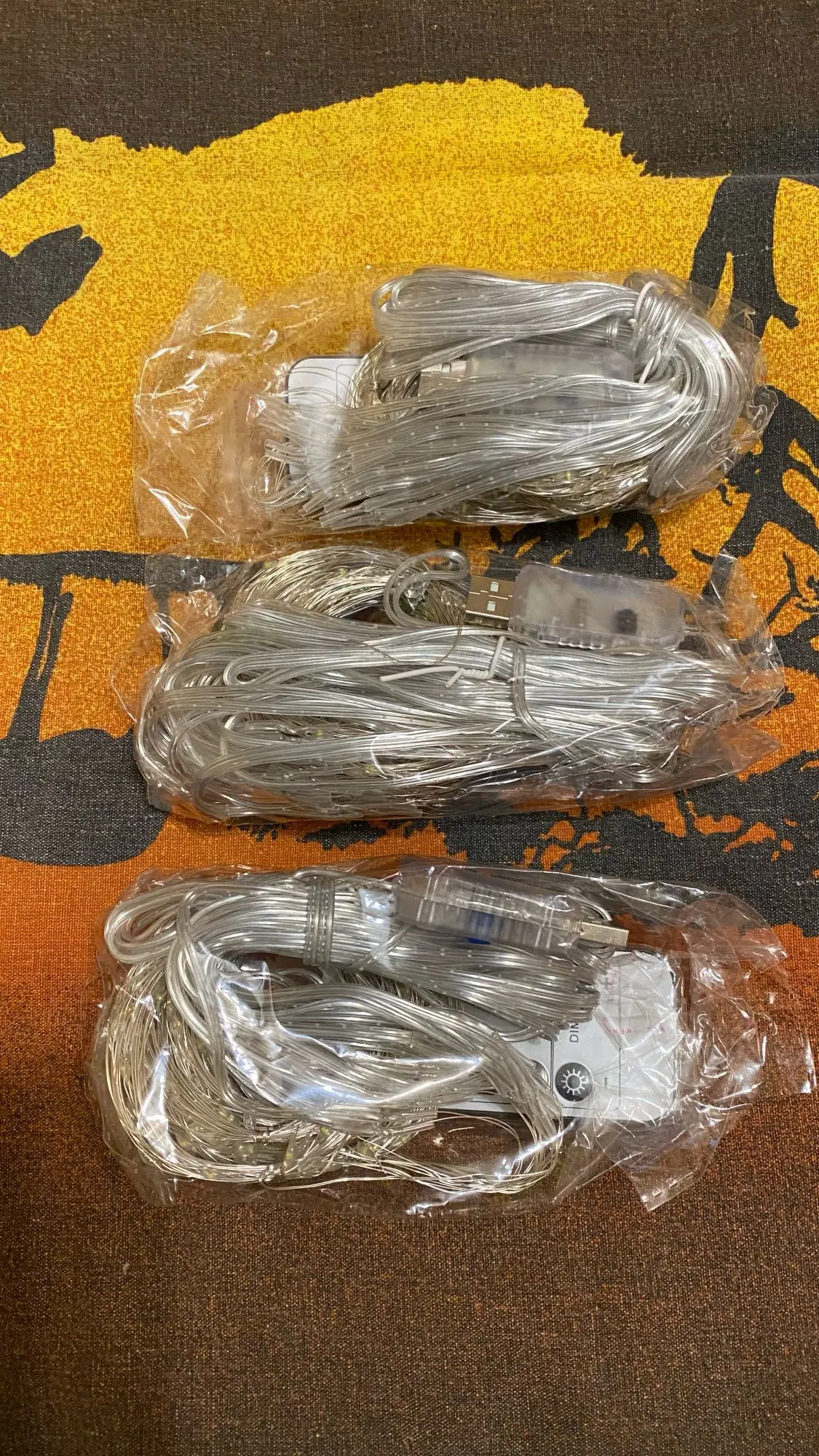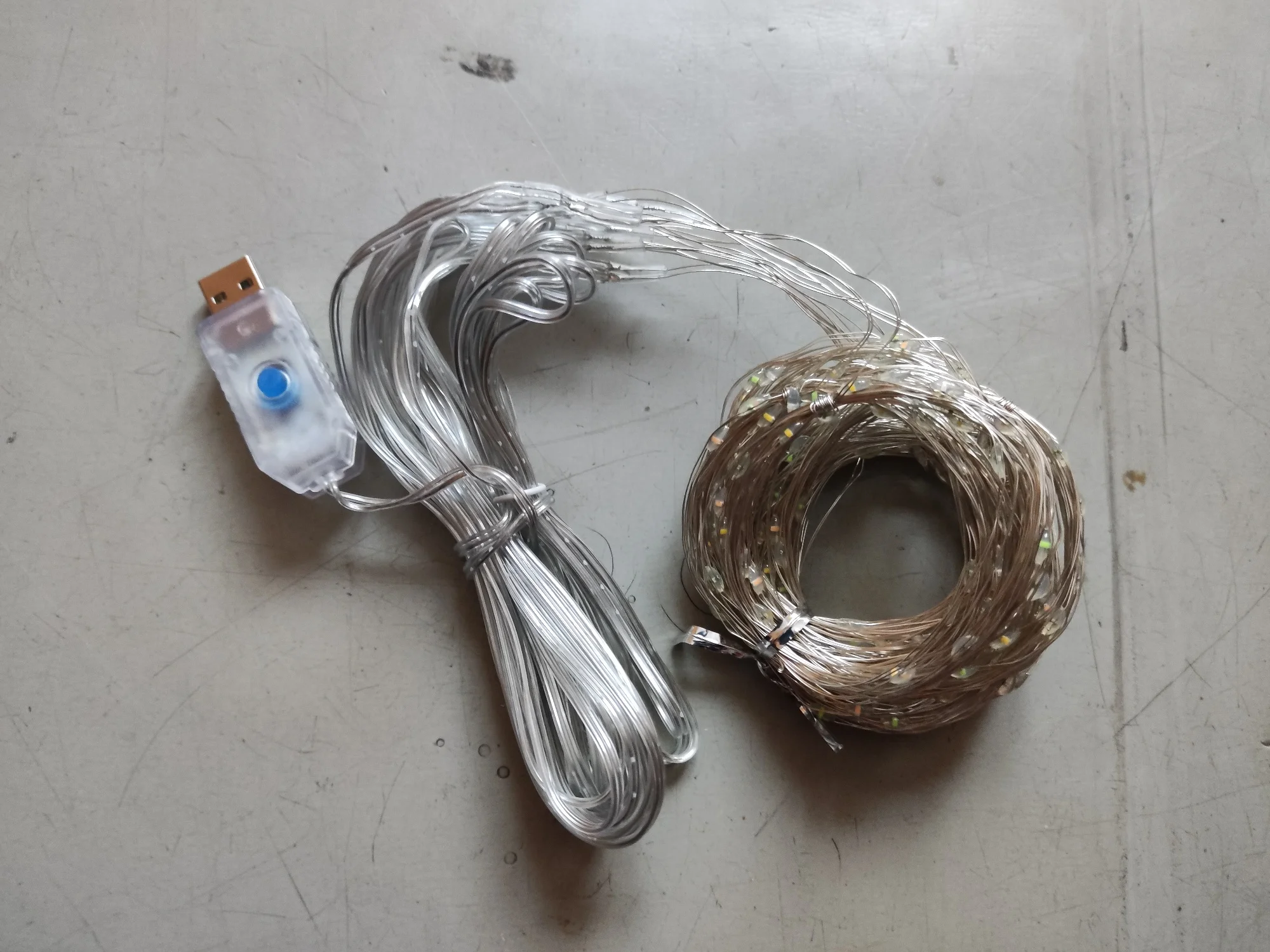 Гирлянда пришла быстро. Работает от зарядки USB, кнопка на штекере переключает режимы. Ниточек из тонких светодиодов в занавесе всего 10, т.е. расположены примерно через 30 см. Сложили вдвое со сдвигом, получилось через 15. Ниточки свиты в кольца, провод достаточно жесткий расправить в вертикальные линии реально только с прикрепленным грузом. Пульт без батарейки, но особо и не нужен.