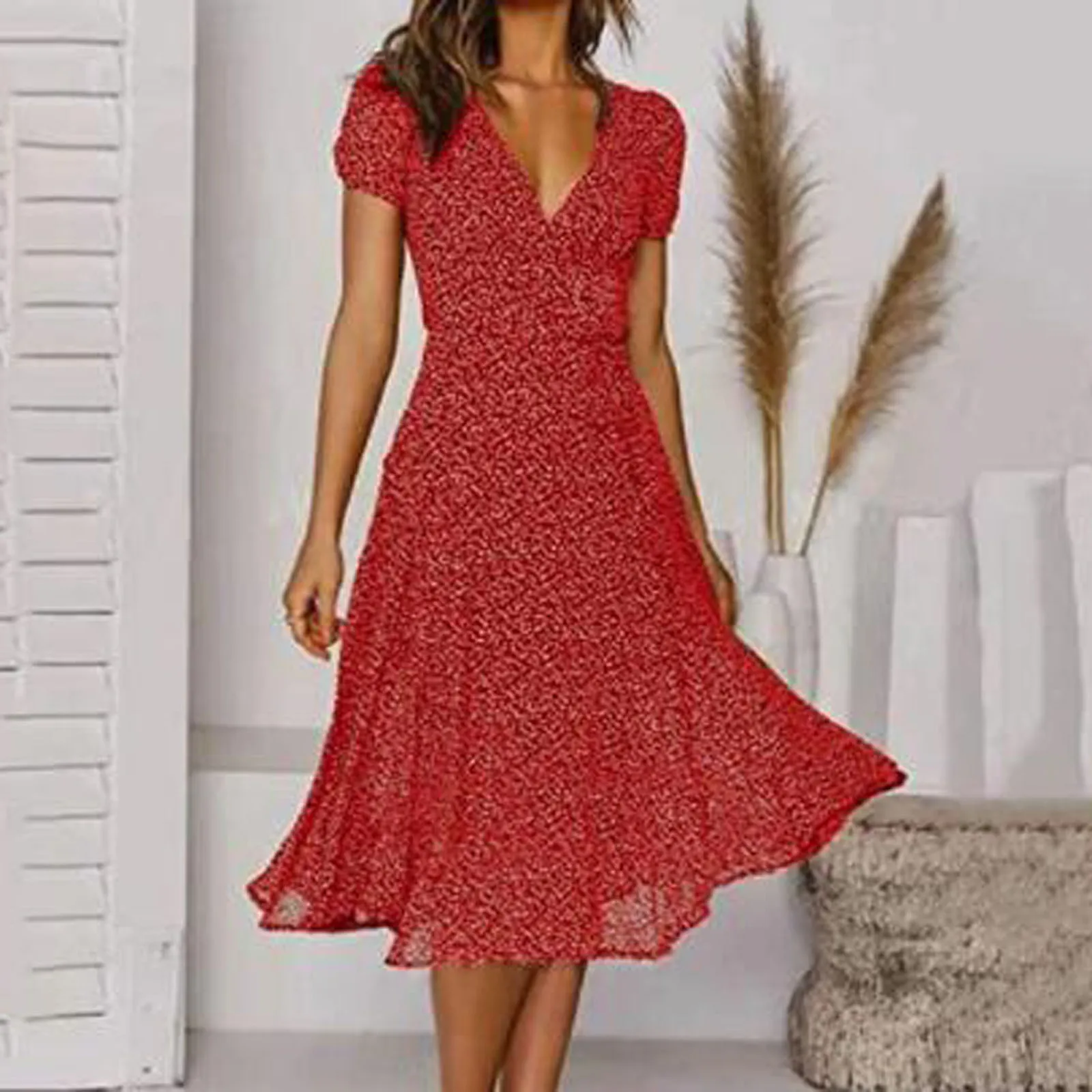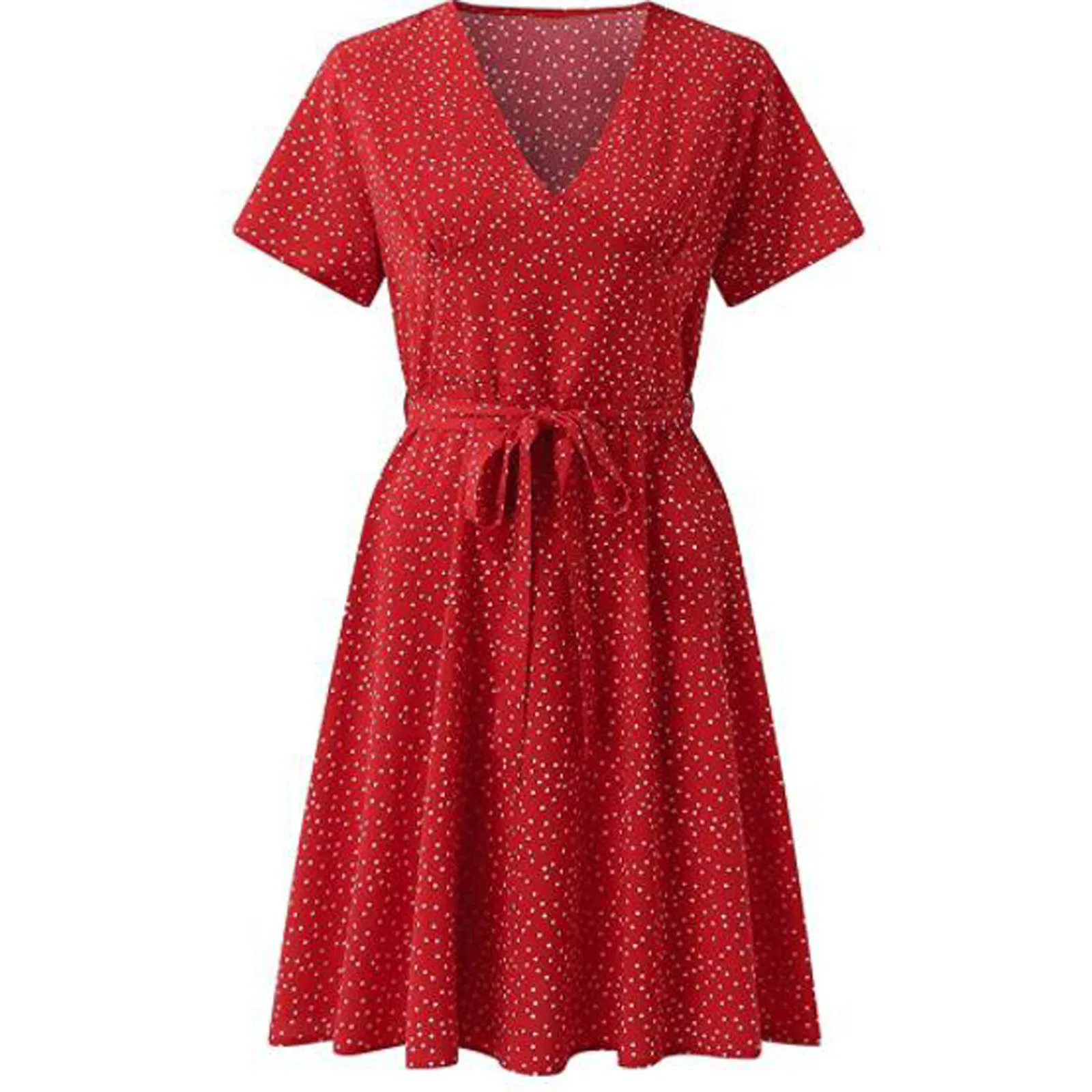 Женское платье в горошек, с V-образным вырезом и коротким рукавом